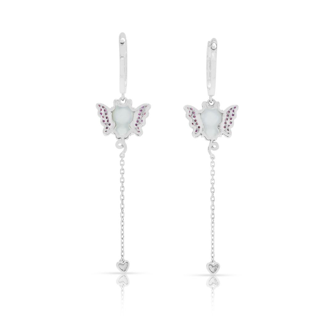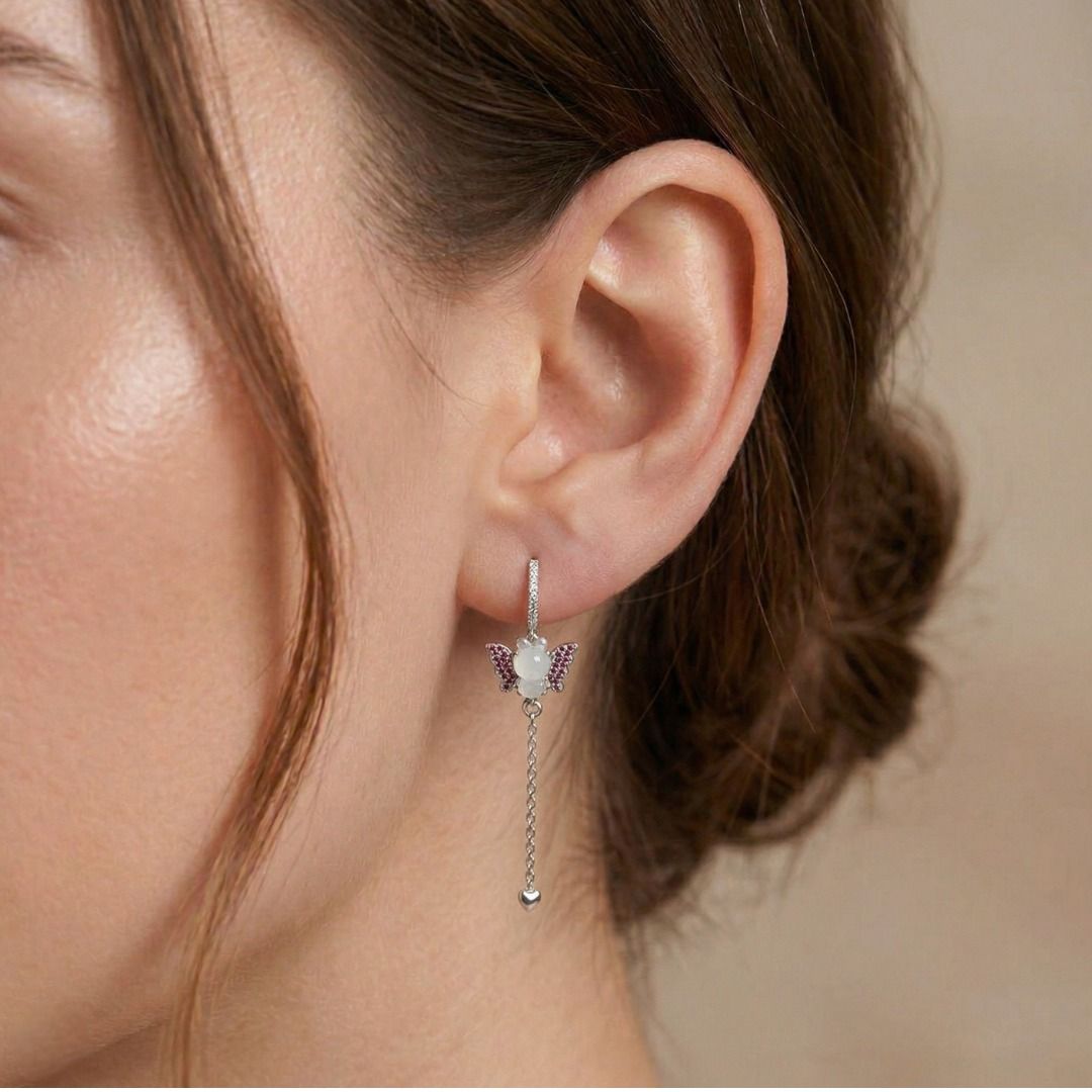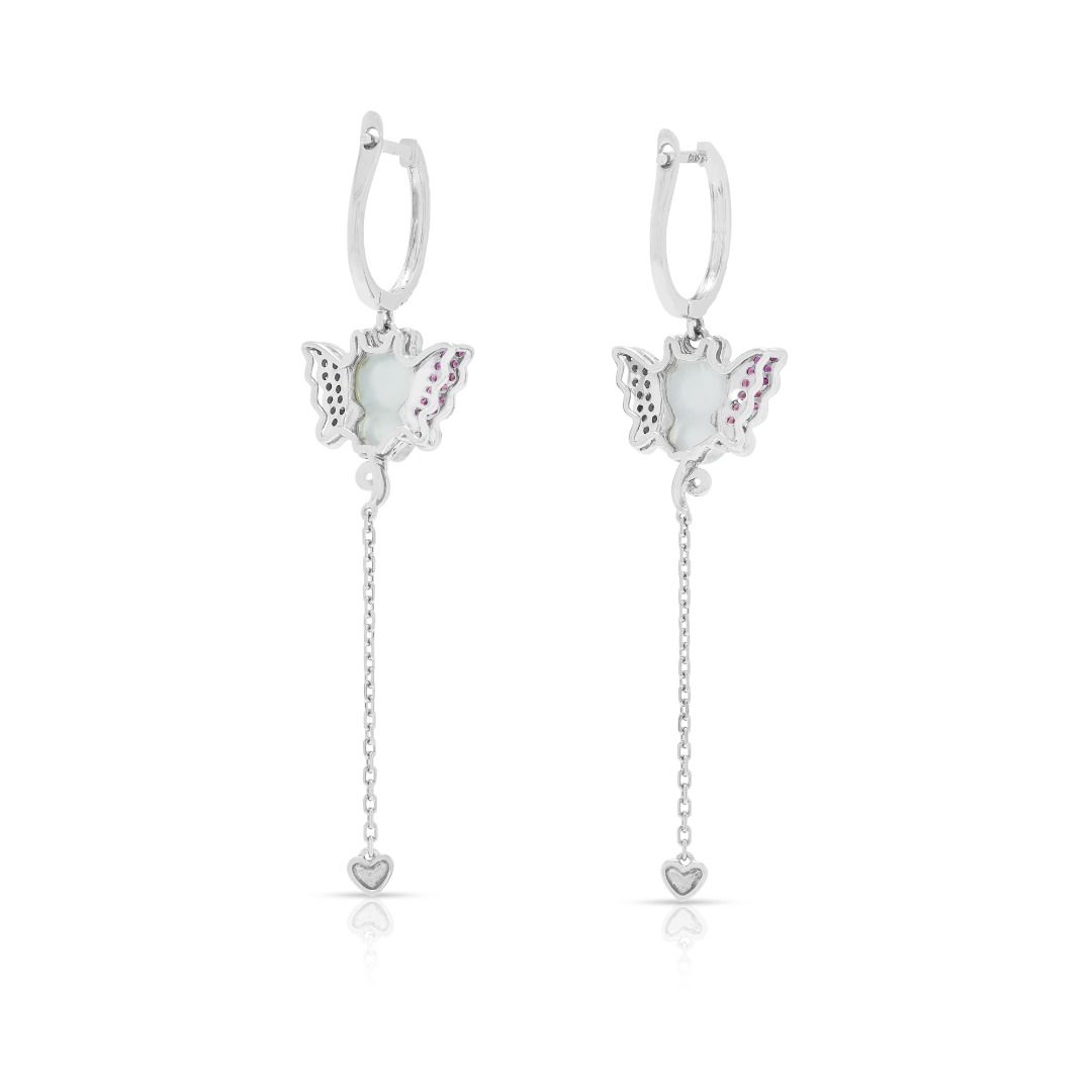 זוג עגילים המשלבים אומנות עם קסם תוסס. עשויים מזהב לבן 18K, הם משובצים בשני פריטי ג'ייד מגולפים בגוון קרח יחד עם 56 אבני ספיר ורודות בחיתוך עגול מבריק (0.14ct סה"כ) למראה מלא חיים. העיצוב משופר עוד יותר על ידי 34 יהלומים בחיתוך עגול מבריק (0.10ct סה"כ, צבע I, ניקיון SI), המוסיפים ניצוץ לצללית השובבה. עם משקל קראט כולל של 0.24ct, משקל תכשיט של 4.12g, ואורך של 54mm, עגילים אלה מגלמים תחכום שובב ואומנות מעודנת, מושלמים לסגנון הצהרתי.