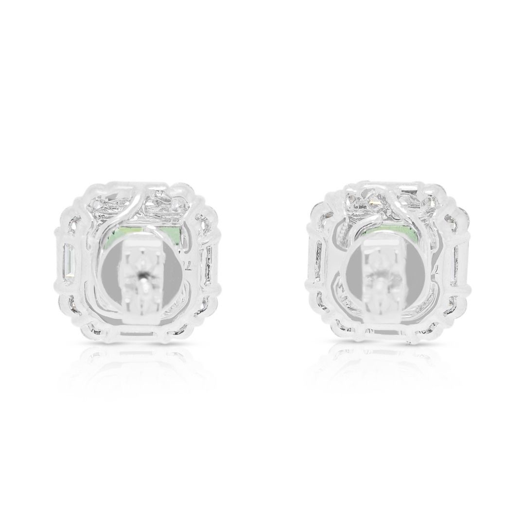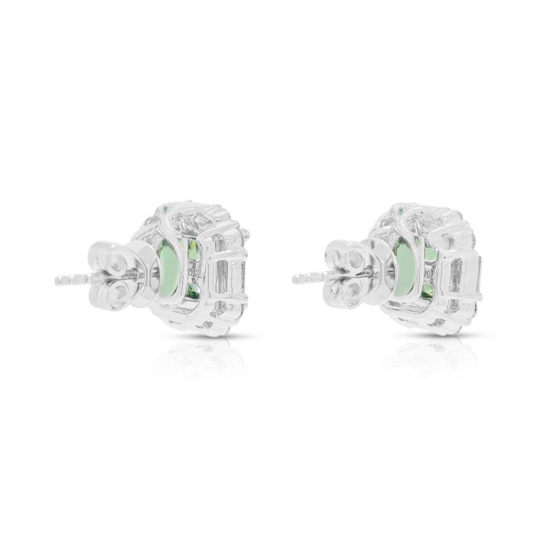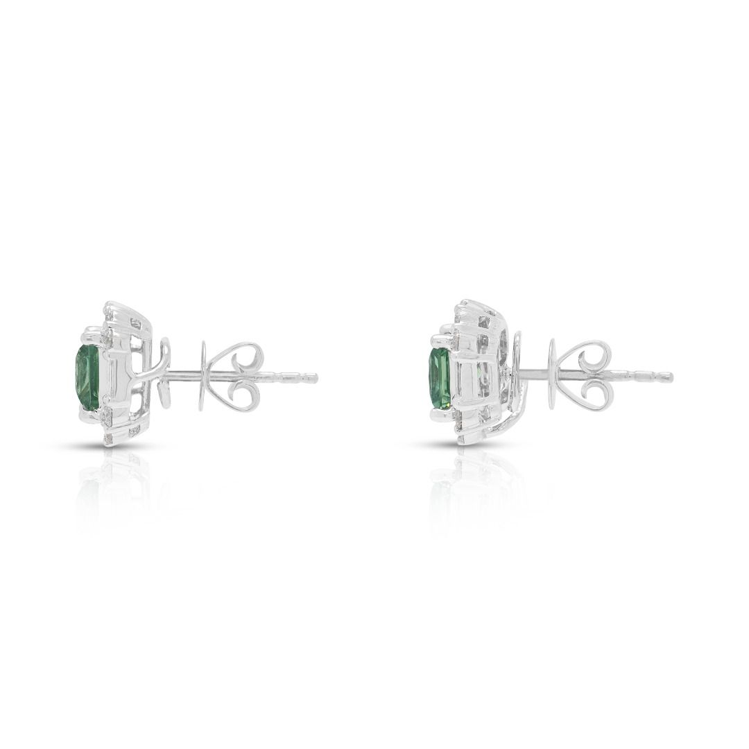 עגילי הילה צמודים מזהב לבן 18 קראט, משובצים בקוורץ ירוק זוהר במשקל 2 קראט ויהלומים במשקל 1.36 קראט