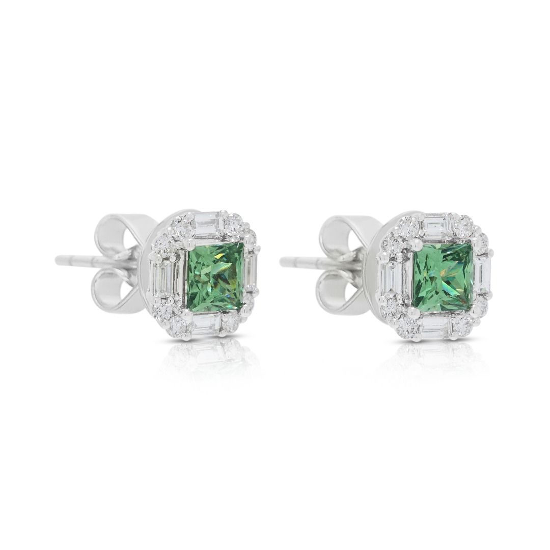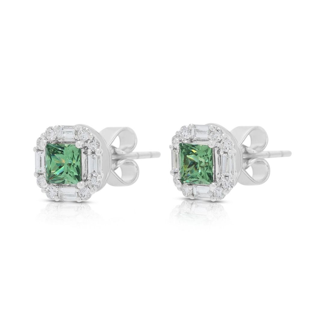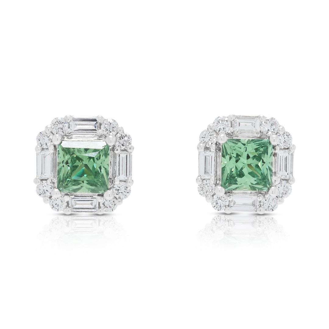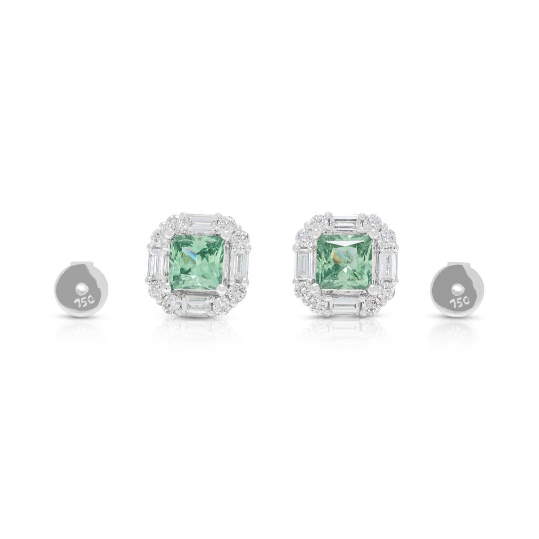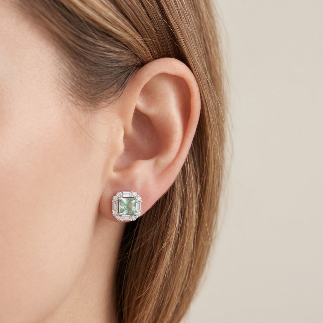 עגילים צמודים מרשימים אלה עשויים מזהב לבן 18 קראט, מציגים שתי אבני קוורץ ירוק בחיתוך פרינסס (סה"כ 2.00 קראט) כאבני המרכז התוססות שלהם. עיצוב ההילה משופר על ידי 16 יהלומים עגולים מבריקים (סה"כ 0.40 קראט, צבע G, ניקיון VS) ו-8 יהלומי באגט (סה"כ 0.96 קראט, צבע G, ניקיון VS), המביאים את משקל היהלומים ל-1.36 קראט. עם משקל תכשיט של 4.78 גרם ומידות של 1 ס"מ x 1 ס"מ, השיבוץ הגיאומטרי משלב צבע נועז עם ניצוץ זוהר. זוג מעודן המדגיש אומנות ואלגנטיות, מושלם לאספני תכשיטים יוקרתיים או כהצהרה של תחכום מודרני.