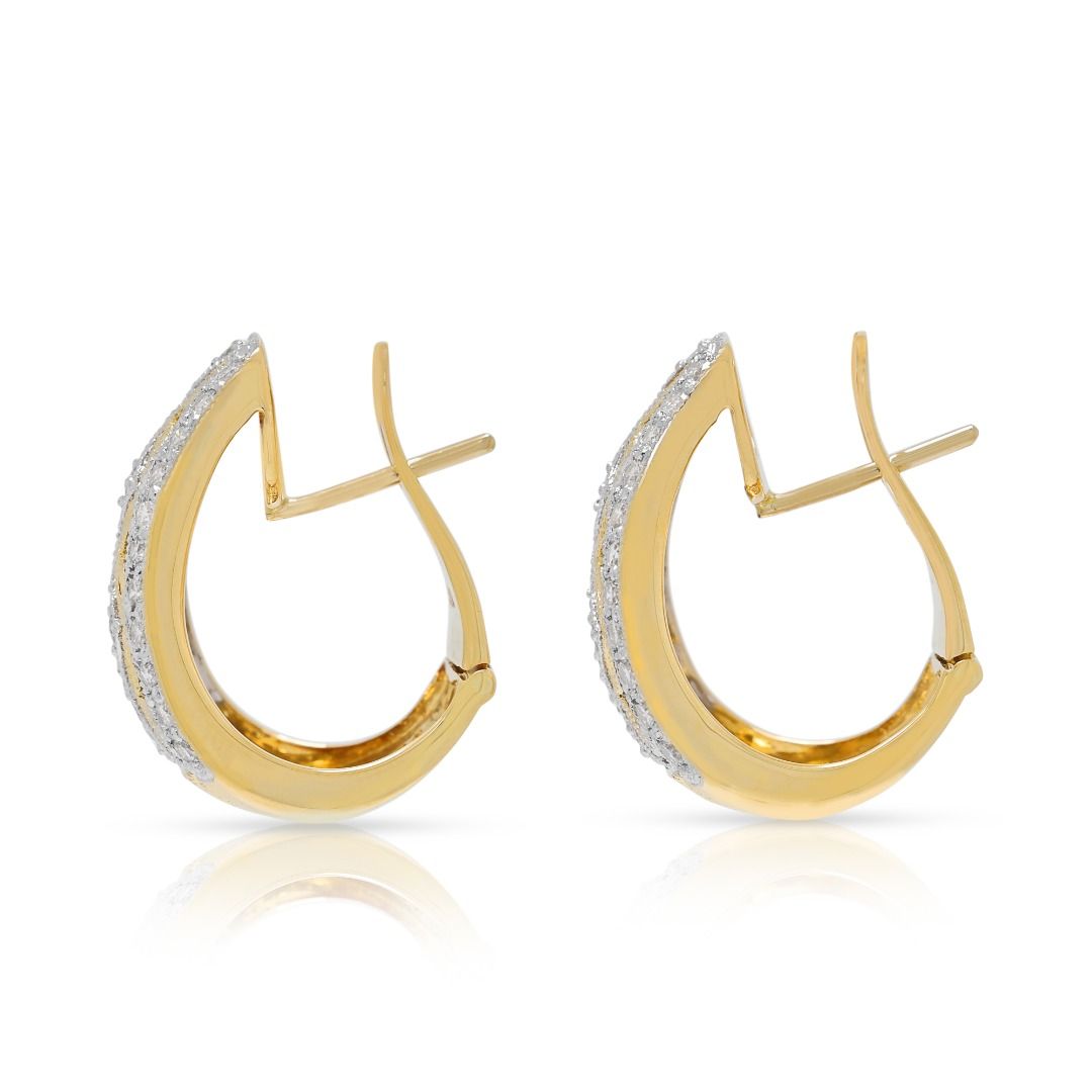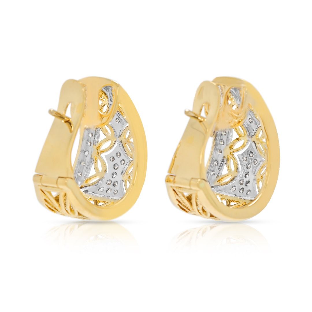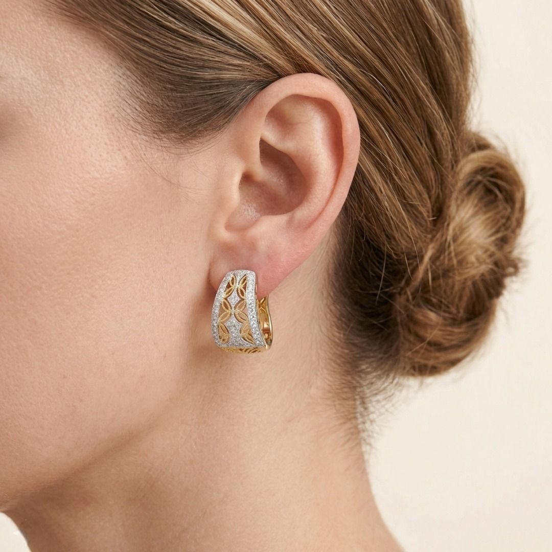 מעוצבים לבלוט, עגילים אלה משובצים ב-68 יהלומים טבעיים בחיתוך עגול מבריק, במשקל כולל של 1.02 קראט, בצבע G-H ובניקיון VS, המעניקים ברק חי ותוסס המושך את העין. הצללית הפתוחה מציגה עיצוב דו-גוני מורכב, המשלב זהב צהוב חם עם הדגשים נוצצים של יהלומים לבנים משובצים, לתוספת עומק וממד. במידות 20X18 מ"מ ובמשקל 9.92 גרם, הם מציעים נוכחות נועזת אך מאוזנת על האוזן. זוג הצהרתי המשלב אומנות, ברק ואלגנטיות מודרנית ביצירה מעודנת אחת.