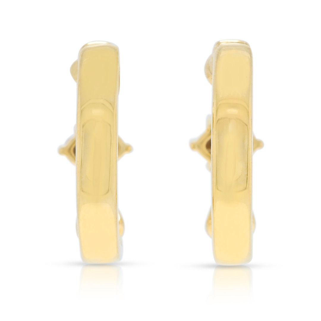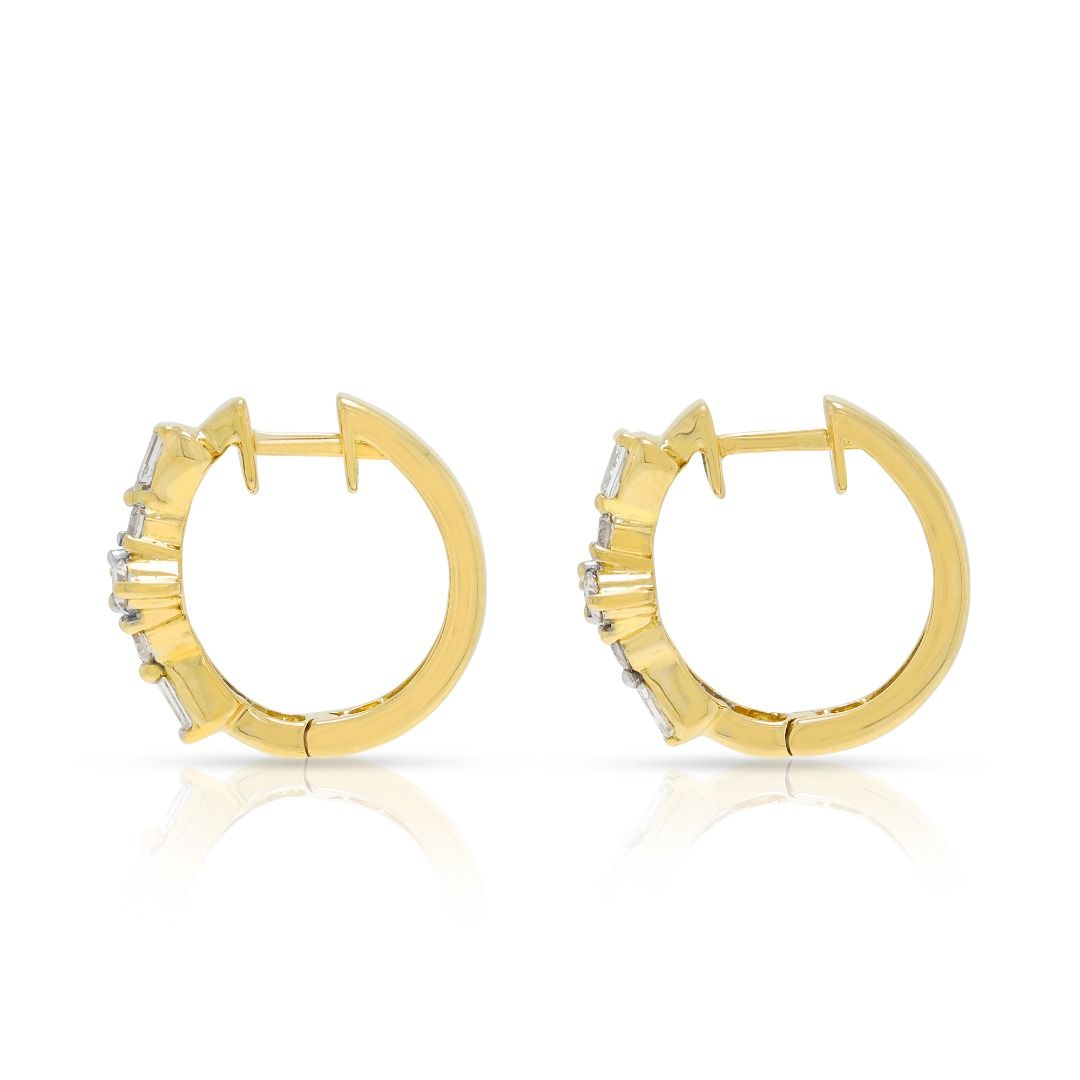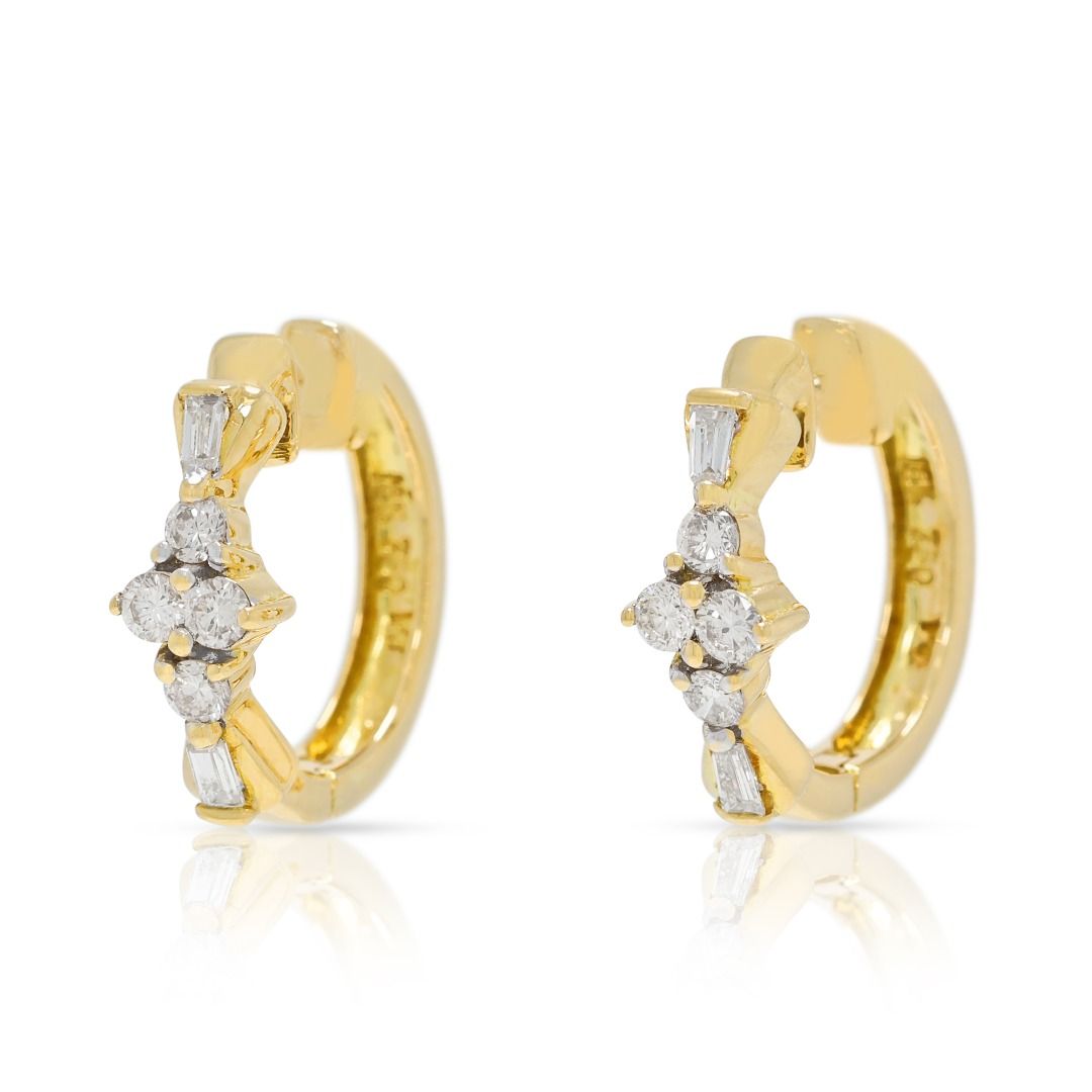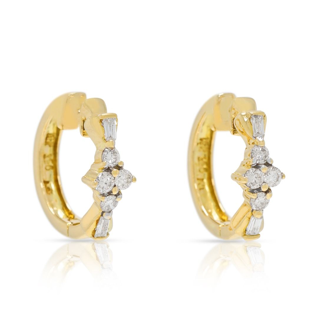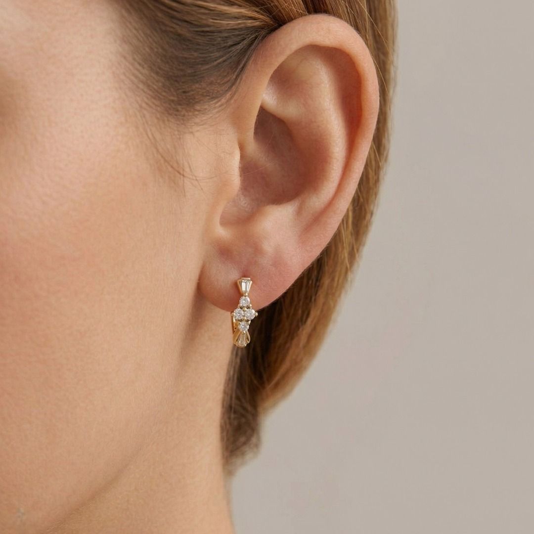זוג עגילי חישוק המנצנצים בתחכום מאופק. עשויים מזהב דו-גוני 18 קראט, הם משובצים ב-8 יהלומים טבעיים בחיתוך עגול מבריק (סה"כ 0.20 קרט, צבע I–J, ניקיון SI1) ומועשרים ב-4 יהלומים בחיתוך טייפר (סה"כ 0.08 קרט, צבע I–J, ניקיון SI1). עם משקל כולל של 0.28 קרט, משקל תכשיט של 4.18 גרם, ואורך של 15 מ"מ, עגילים אלה מאזנים עיצוב מודרני עם ברק נצחי, מה שהופך אותם לתכשיט רב-גוני לאלגנטיות רשמית ויומיומית כאחד.