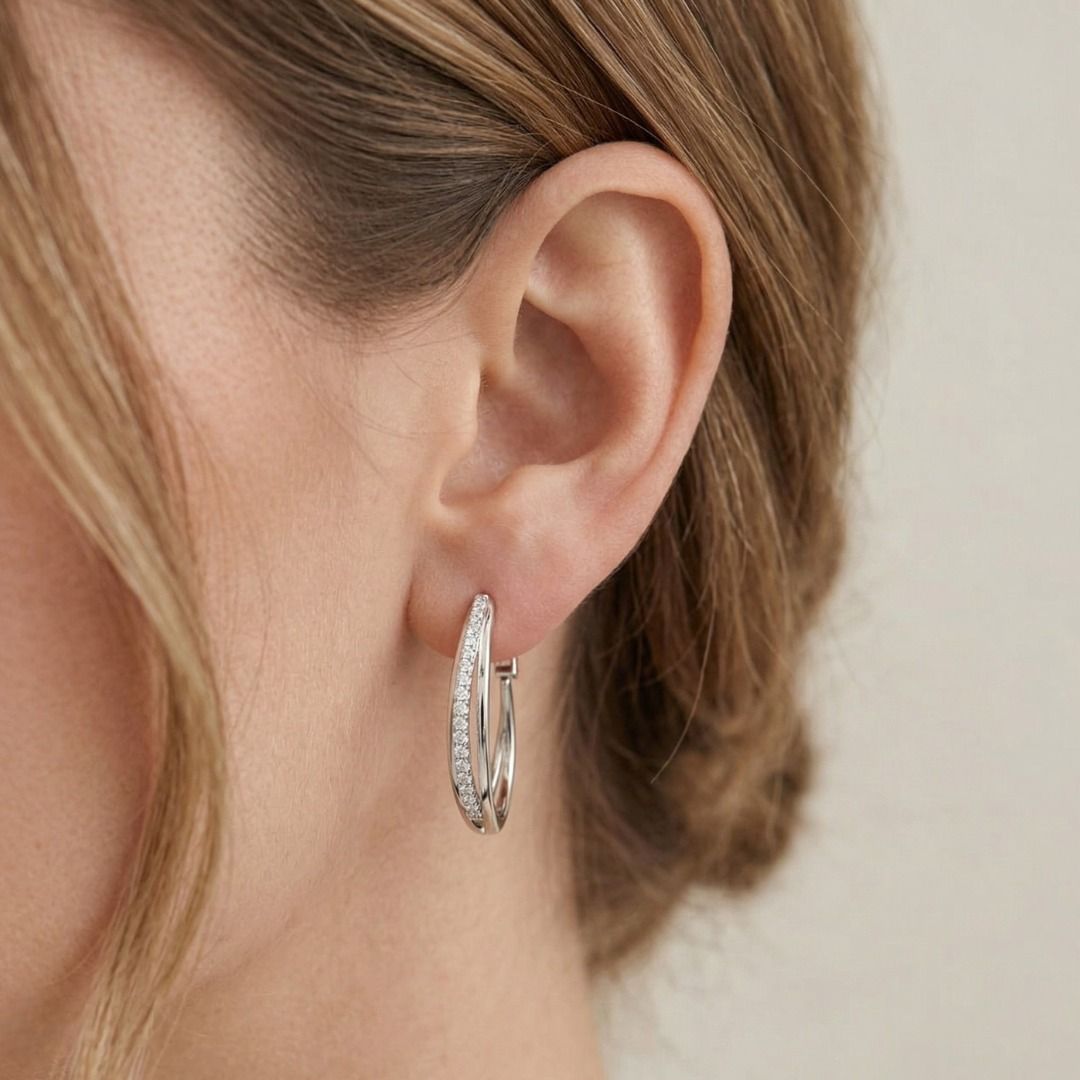 עשויים מזהב לבן 18 קראט, עגילי חישוק Destinee אלגנטיים אלה משובצים ב-40 יהלומים טבעיים בחיתוך עגול מבריק, במשקל כולל של 0.48 קראט, בדירוג צבע G וניקיון VS, לברק זוהר ומעודן. היהלומים משובצים בקפידה לאורך העקומה הקדמית, ומעניקים נצנוץ נקי ורציף המדגיש את צלליתם המעוצבת. באורך 28 מ"מ ובמשקל 6.04 גרם, הם מציעים נוכחות בולטת אך נוחה על האוזן. פריט יוקרה נצחי ליום-יום, מסופקים במצב חדש, ללא שימוש.
