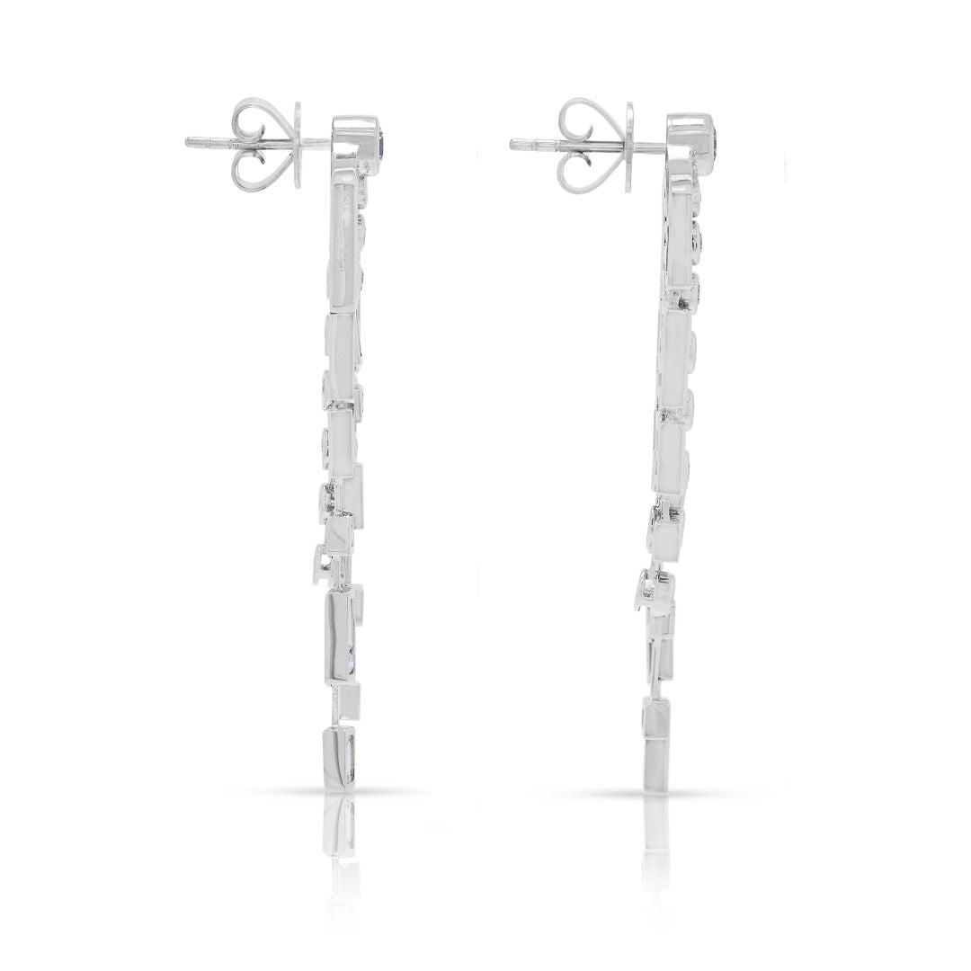 עגילי טיפה מדורגים אלה משובצים ב-56 יהלומים עגולים בחיתוך בריליאנט (1.40 קרט) ו-22 יהלומים בחיתוך טייפר (0.77 קרט), כולם בצבע F-G ובניקיון VS. משובצים בזהב לבן מלוטש 18K, מידותיהם 12 מ"מ x 42 מ"מ ומשקלם הכולל 8.99 גרם. השרשראות המדורגות והברק הסימטרי יוצרים צללית חיננית – מושלמים לאירועים רשמיים או ללבוש ערב בולט.