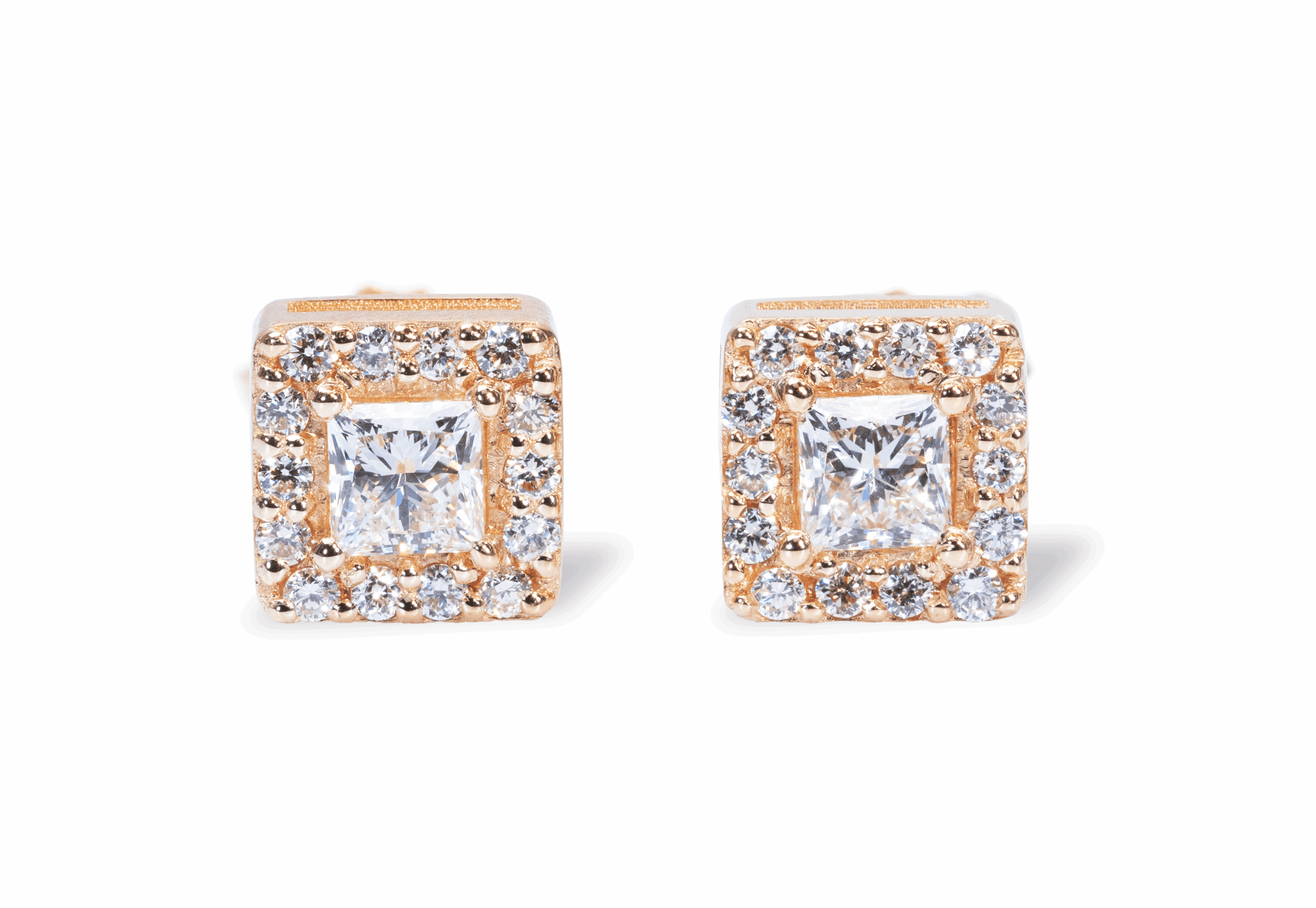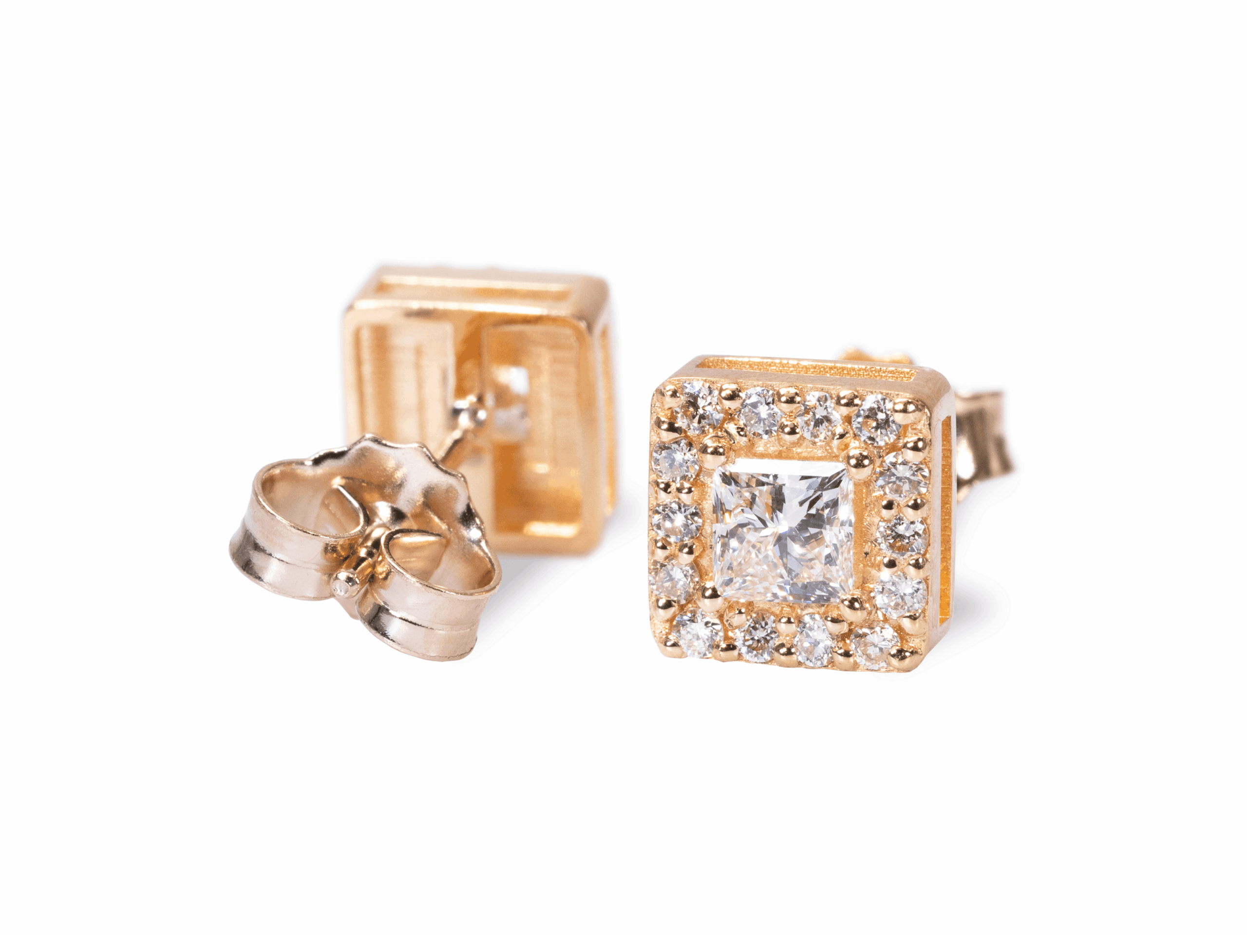 עגילי יהלום פרינסס אלו משובצים ביהלום מרכזי בליטוש נסיכה והילת יהלומים קטנים מסביב. ניתן ליצרם במגוון איכויות וגדלים וכמובן משקלים. כאן משובצים יהלומים במשקל 0.40 כל אחד ועוד יהלומים קטנים במשקל 0.20. משקל כולל – 1 קראט.