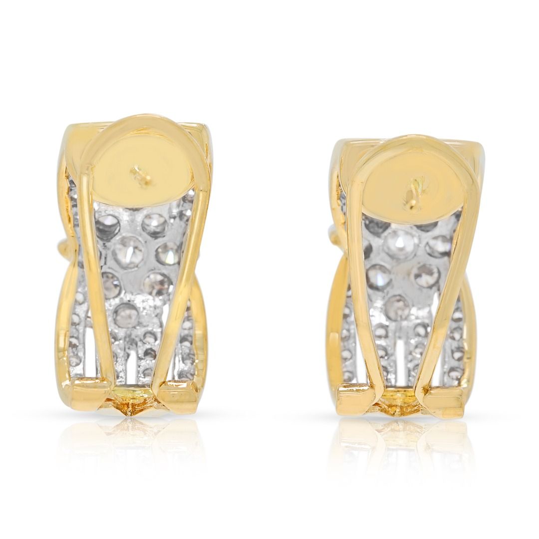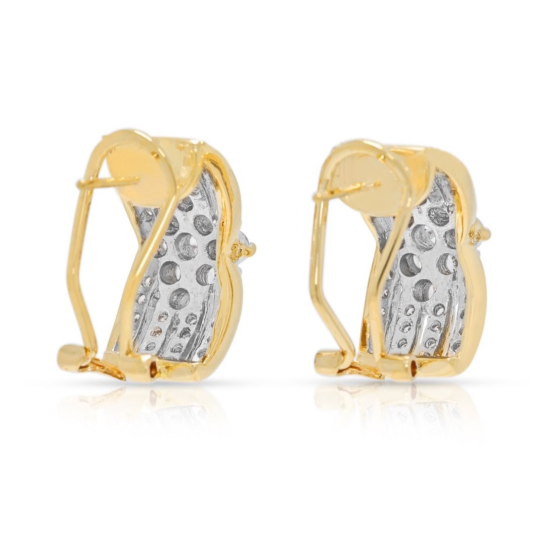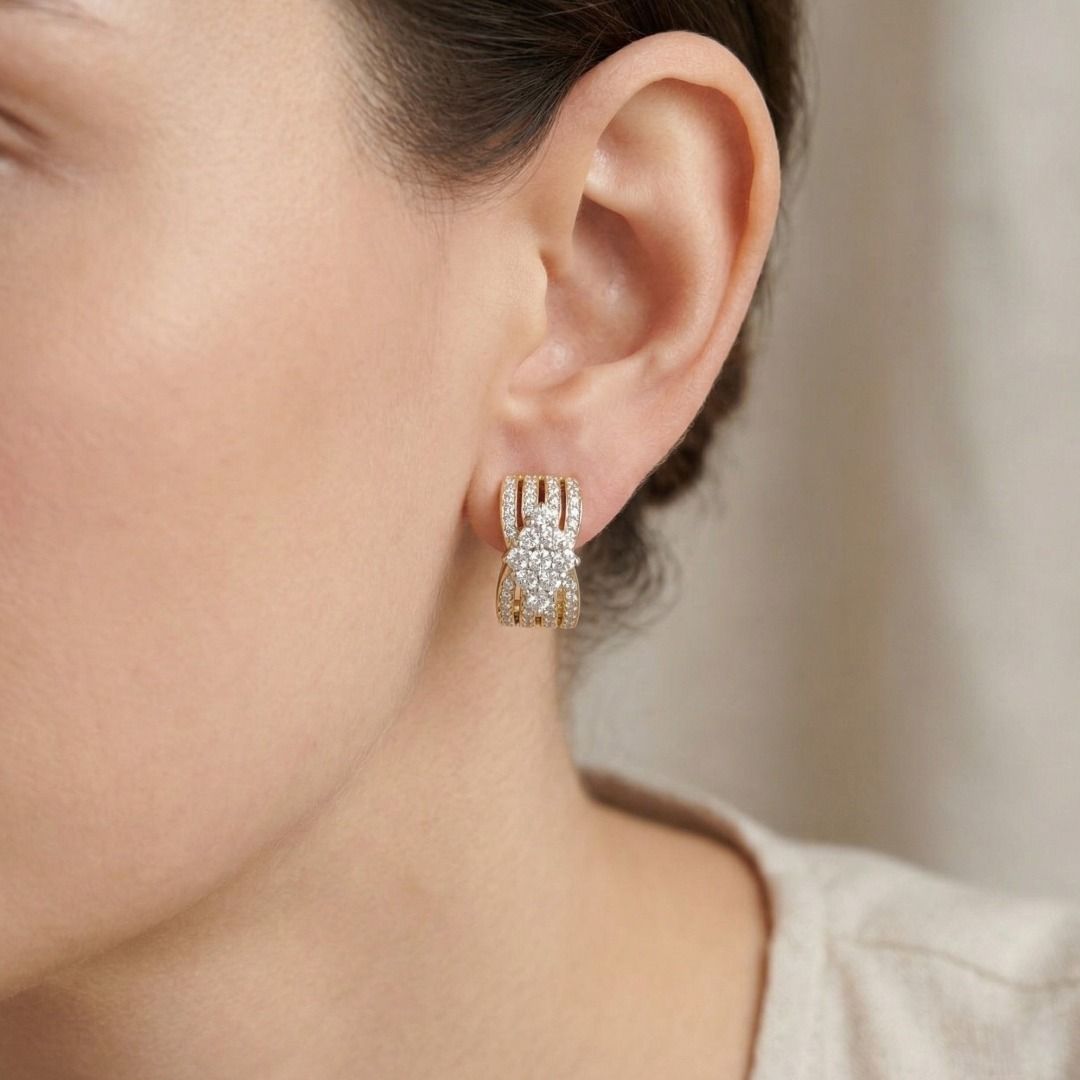 זוג עגילים הזוהרים בתחכום נצחי. עשויים מזהב דו-גוני 18 קראט, הם משובצים ב-18 יהלומים טבעיים עגולים בחיתוך בריליאנט (סה"כ 0.72 קרט, צבע G–H, ניקיון VS) ומשופרים על ידי 80 יהלומים עגולים בחיתוך בריליאנט (סה"כ 0.32 קרט, צבע G–H, ניקיון VS). עם משקל כולל של 1.04 קרט יהלומים, משקל תכשיט של 10.71 גרם, ואורך של 18 מ"מ, עגילים אלה מגלמים אומנות מעודנת וברק זוהר, מה שהופך אותם לתכשיט הצהרתי לאירועים אלגנטיים.