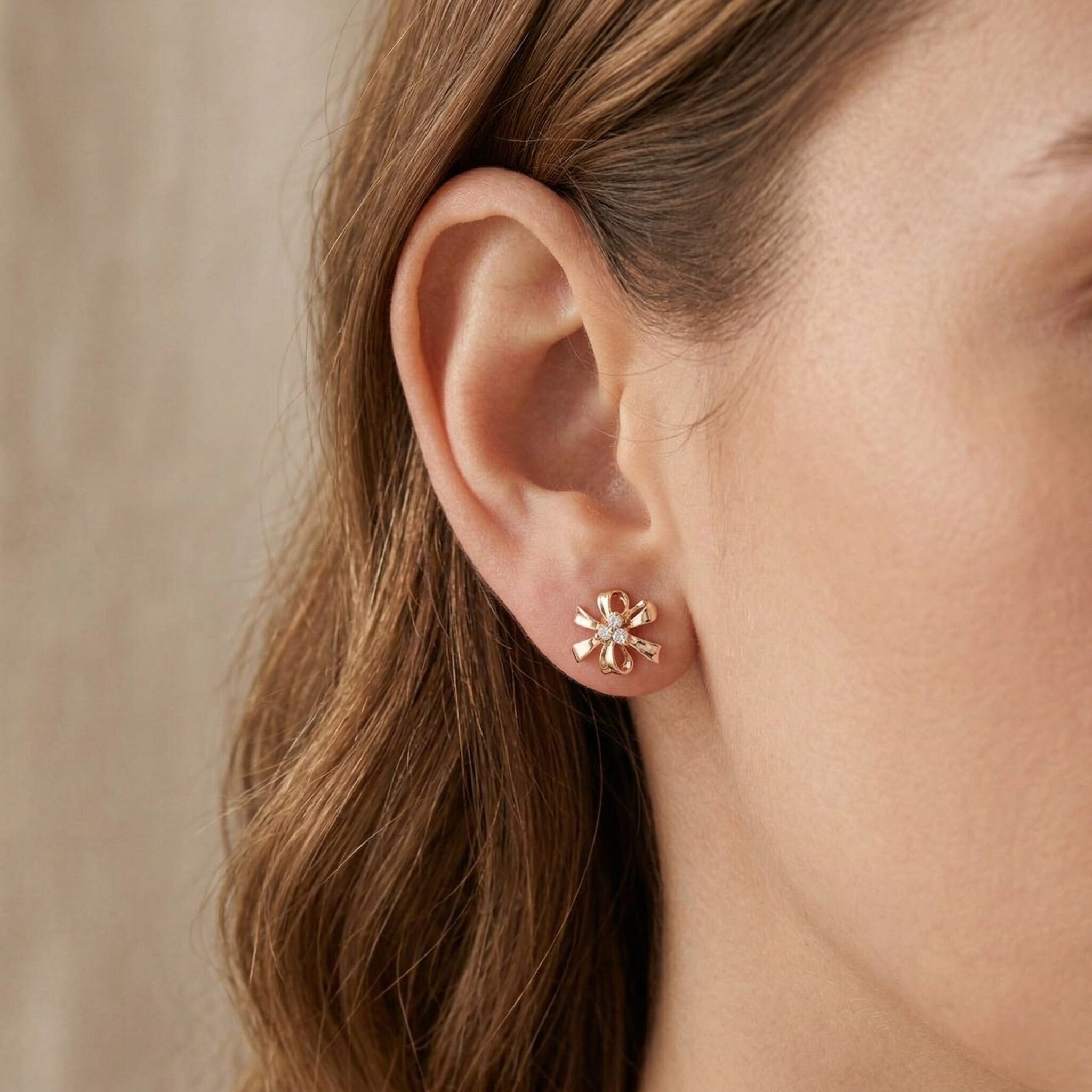 זוהר רומנטי, ניצוץ עדין. עגילים אלו, מזהב אדום 14 קראט, משובצים ב-6 יהלומים טבעיים בחיתוך עגול מבריק (0.12 קרט סך הכל), בדירוג צבע H וניקיון SI, המסודרים בעיצוב פרחוני חינני. עם משקל כולל של 0.12 קרט יהלומים, משקל תכשיט של 1.52 גרם, ומידות של 10 מ"מ x 9 מ"מ, הם עוצבו עבור אספניות החושקות באלגנטיות נשית, ברק מעודן, וצללית המקרינה קסם נצחי.