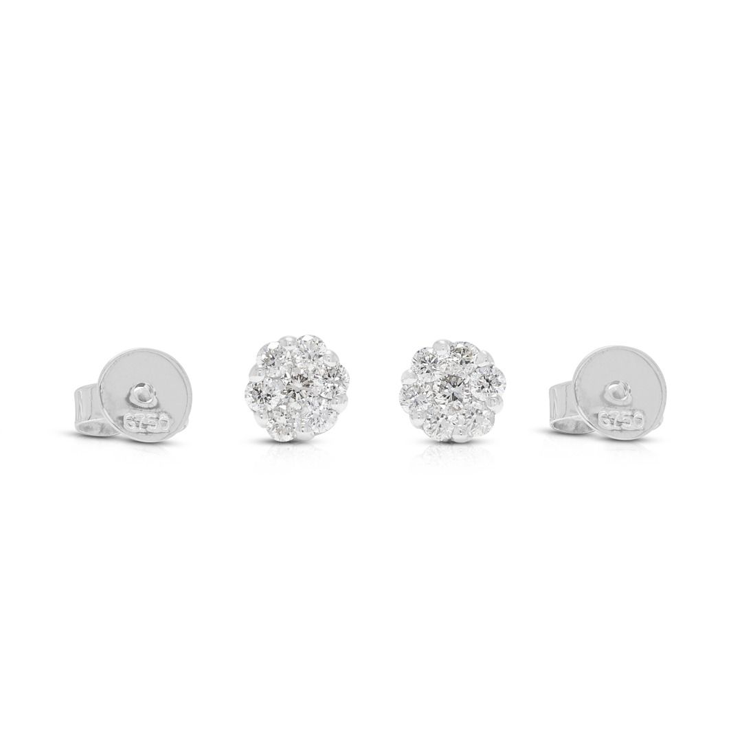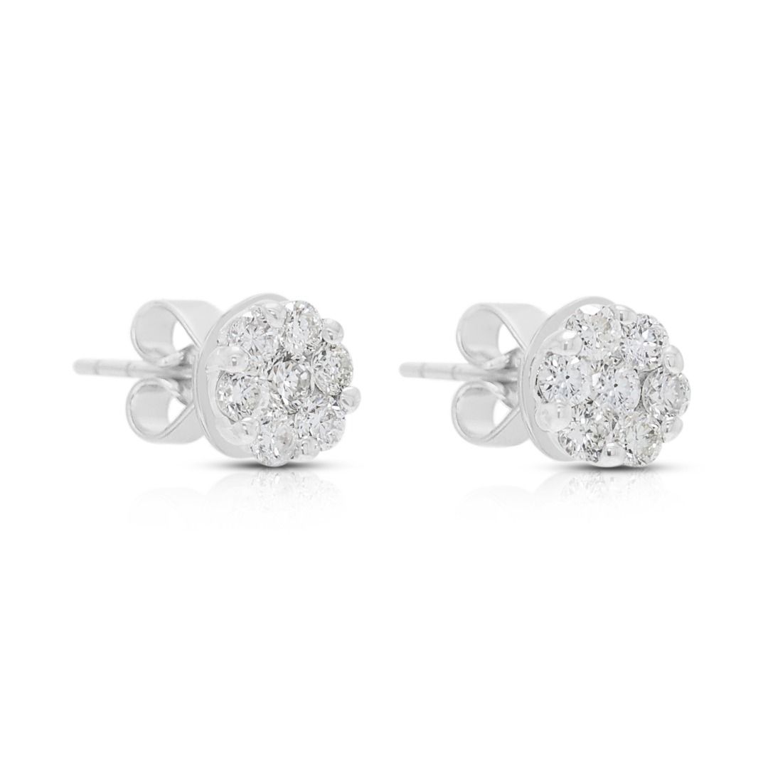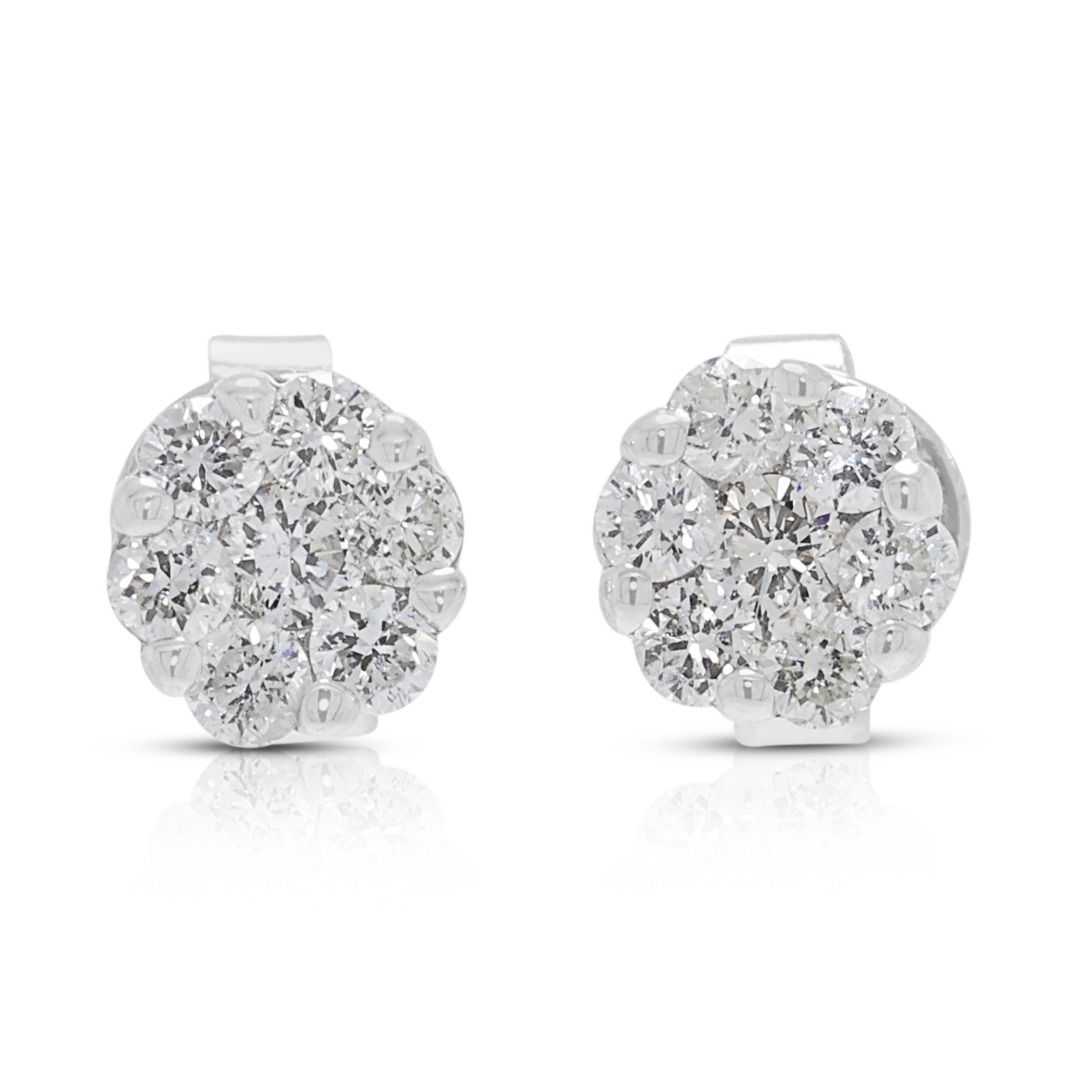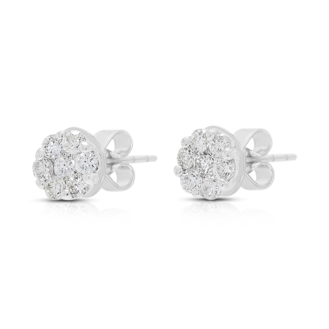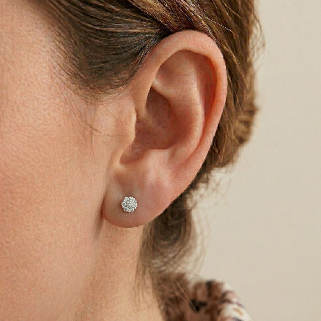 ברק חינני, קסם נצחי. עגילים אלו מזהב לבן 18 קראט משובצים ב-14 יהלומים טבעיים עגולים בחיתוך בריליאנט (סה"כ 0.21 קרט), בדירוג צבע G וניקיון VS, המסודרים באשכול בהשראת פרח המקרין אלגנטיות. עם משקל כולל של 0.21 קרט יהלומים, משקל תכשיט של 0.91 גרם ורוחב של 5 מ"מ, הם עוצבו עבור אספנים המשתוקקים לברק מעודן, פירוט מורכב וצללית המגלמת יוקרה מאופקת.