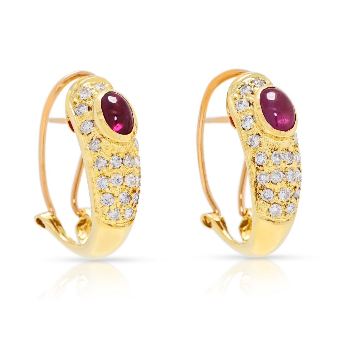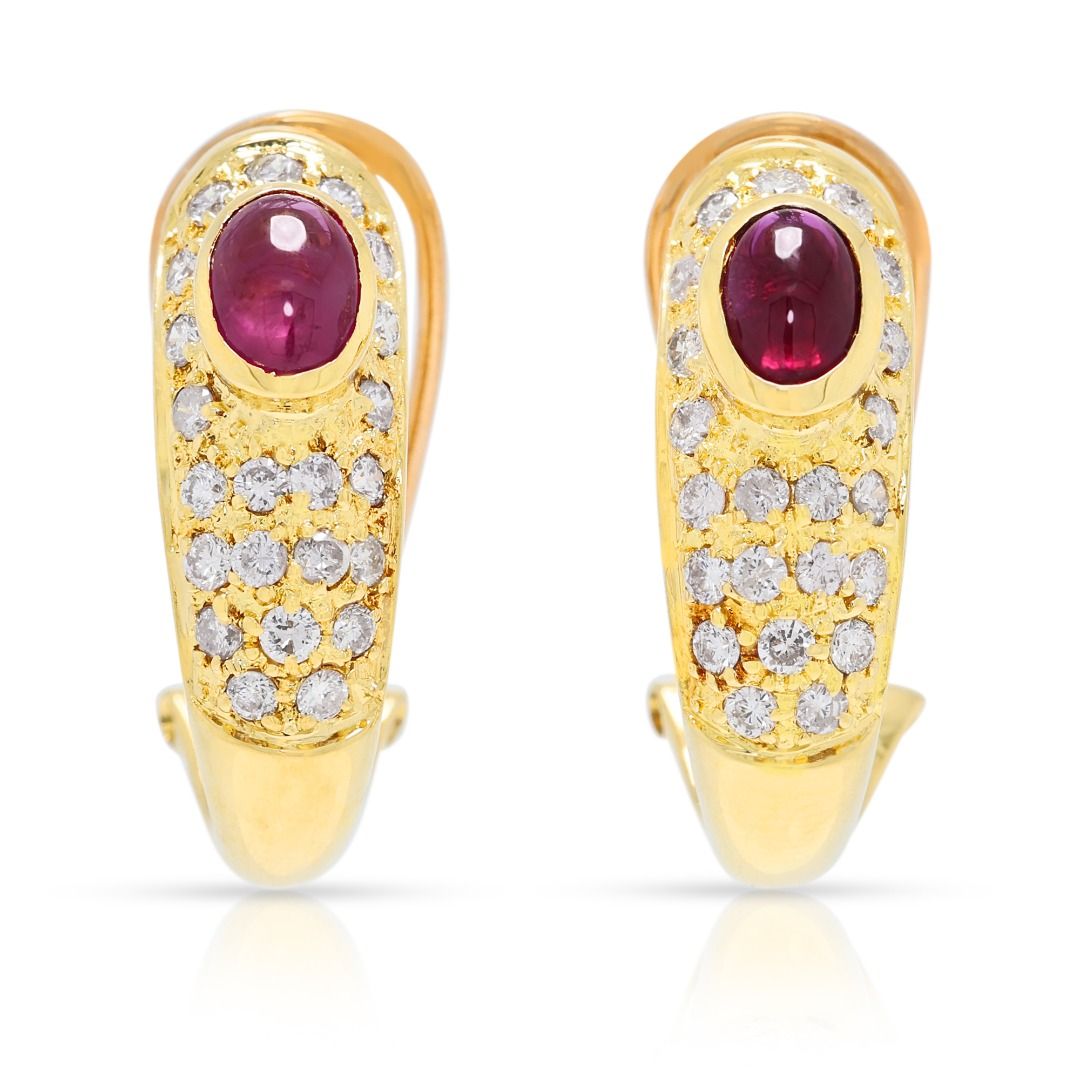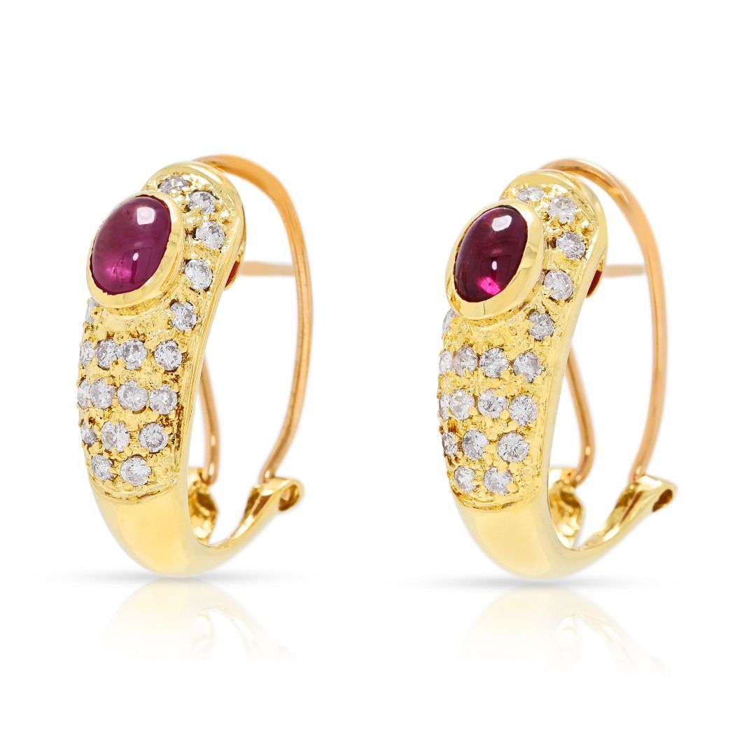 זוג עגילים זוהרים בקסם תוסס. מעוצבים בזהב צהוב 18K, הם משובצים ב-2 אבני רובי קבושון (סה"כ 1.3 קראט, אדמדם-ורדרד) ומודגשים על ידי 44 יהלומים עגולים בחיתוך בריליאנט (סה"כ 0.76 קראט, צבע G–H, ניקיון VS). עם משקל כולל של 2.06 קראט, משקל תכשיט של 8.27 גרם, ומידות של 21 מ"מ x 9 מ"מ, עגילים אלו משלבים צבע נועז עם ניצוץ מעודן, מה שהופך אותם לתכשיט הצהרתי של אלגנטיות ויוקרה.