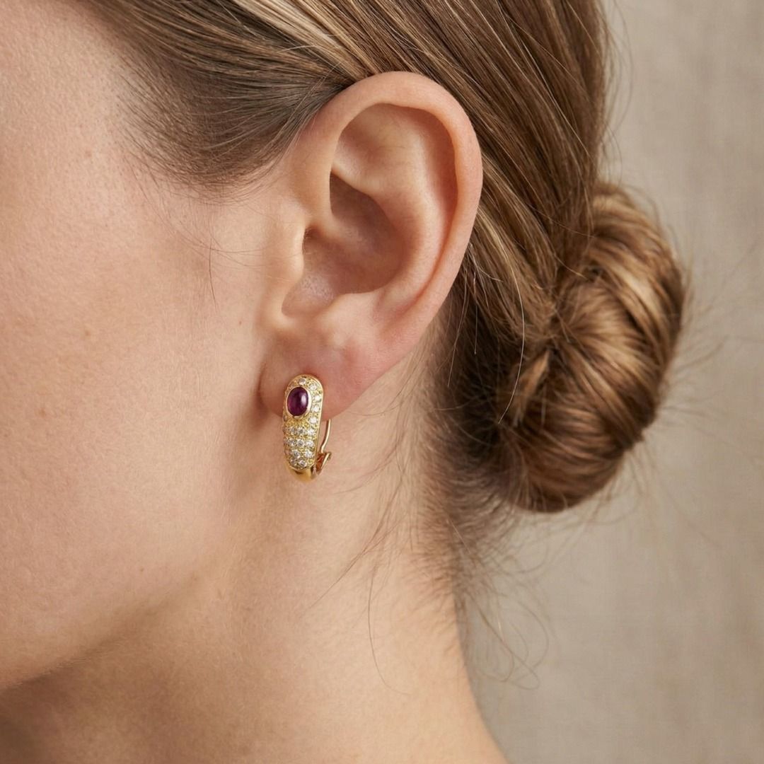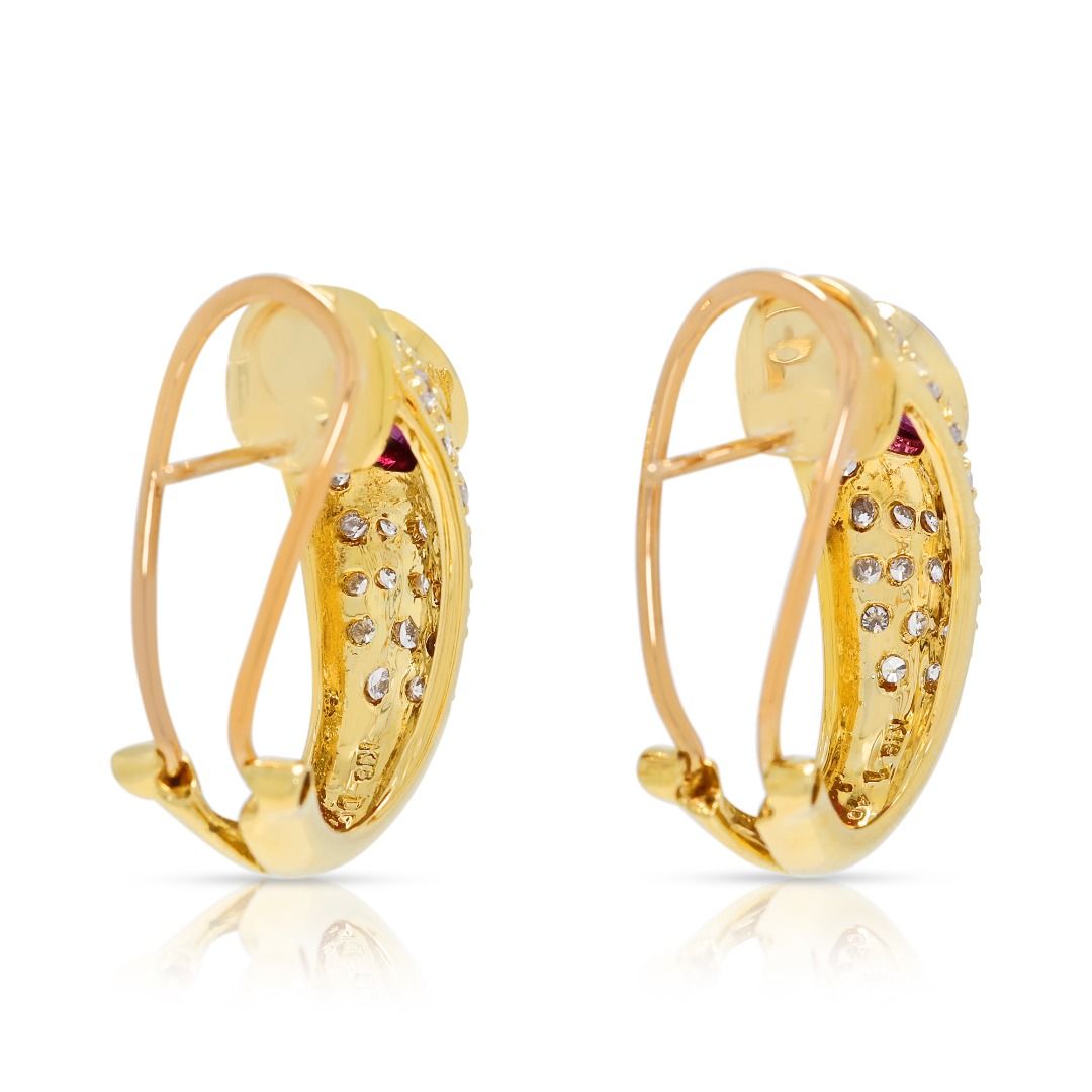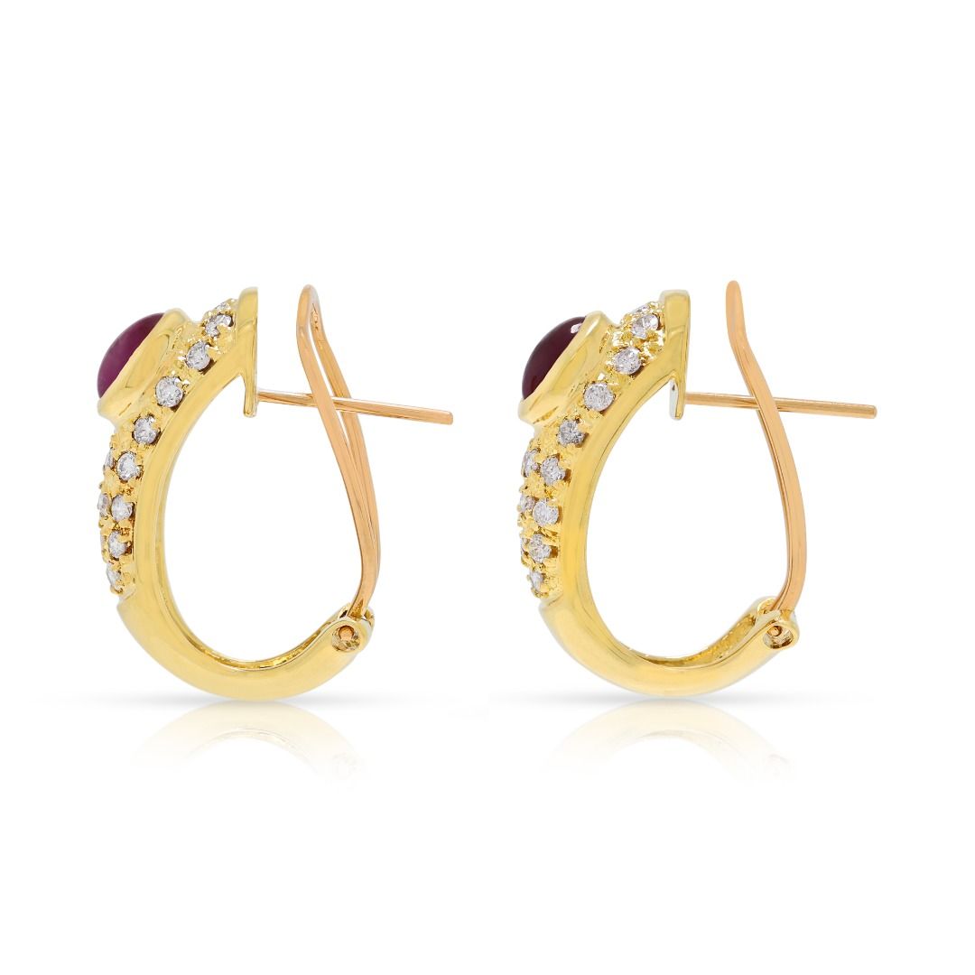זוג עגילים זוהרים בקסם תוסס. מעוצבים בזהב צהוב 18K, הם משובצים ב-2 אבני רובי קבושון (סה"כ 1.3 קראט, אדמדם-ורדרד) ומודגשים על ידי 44 יהלומים עגולים בחיתוך בריליאנט (סה"כ 0.76 קראט, צבע G–H, ניקיון VS). עם משקל כולל של 2.06 קראט, משקל תכשיט של 8.27 גרם, ומידות של 21 מ"מ x 9 מ"מ, עגילים אלו משלבים צבע נועז עם ניצוץ מעודן, מה שהופך אותם לתכשיט הצהרתי של אלגנטיות ויוקרה.