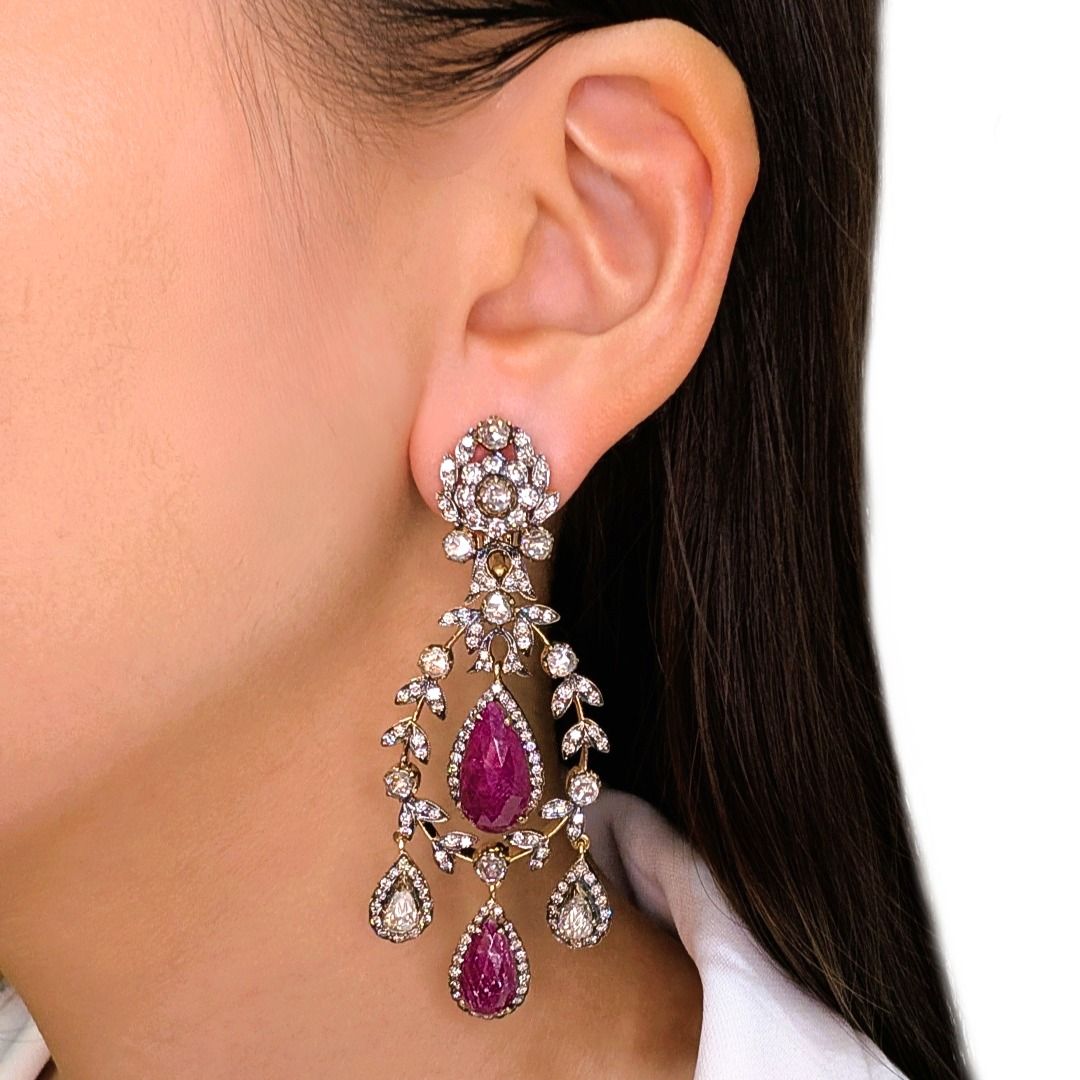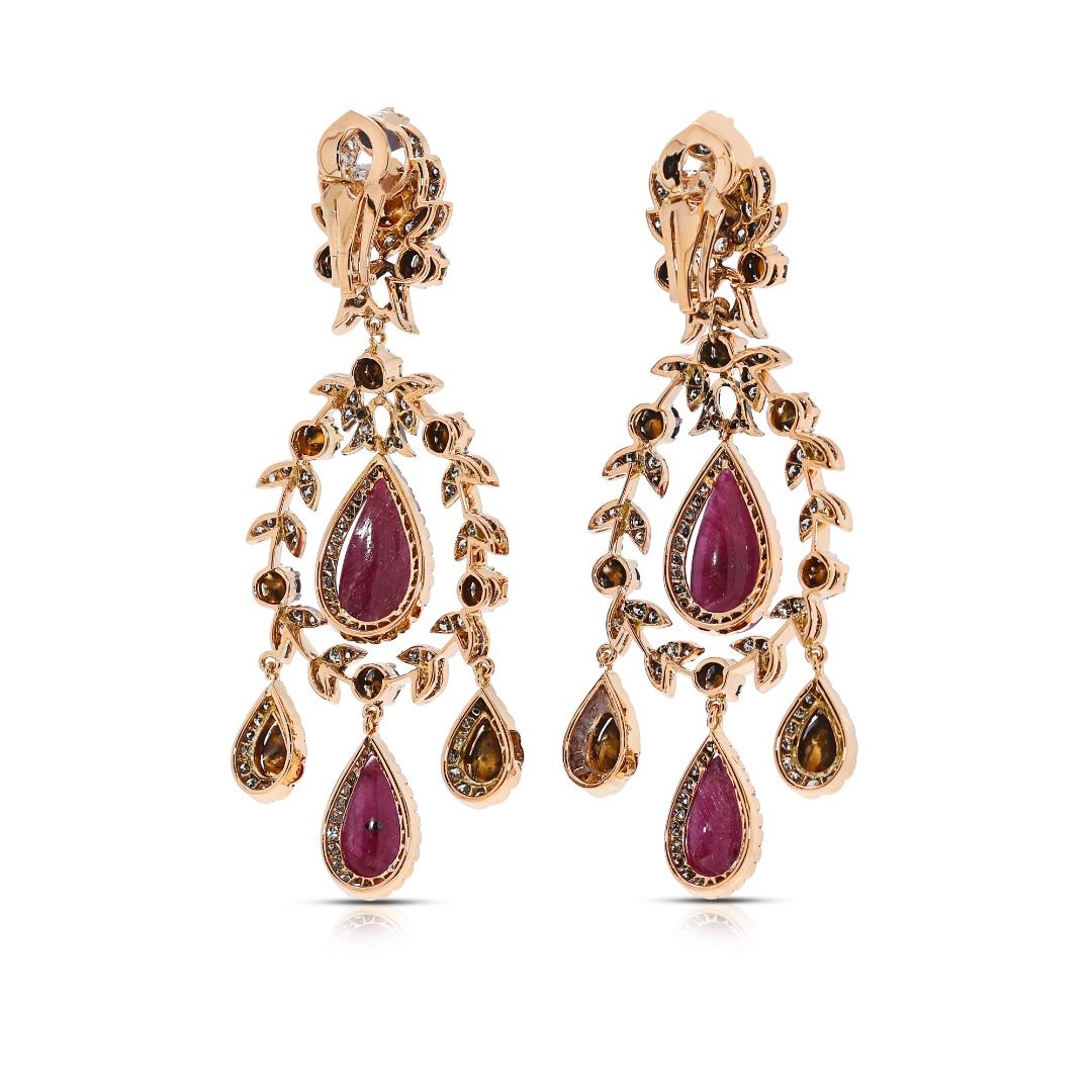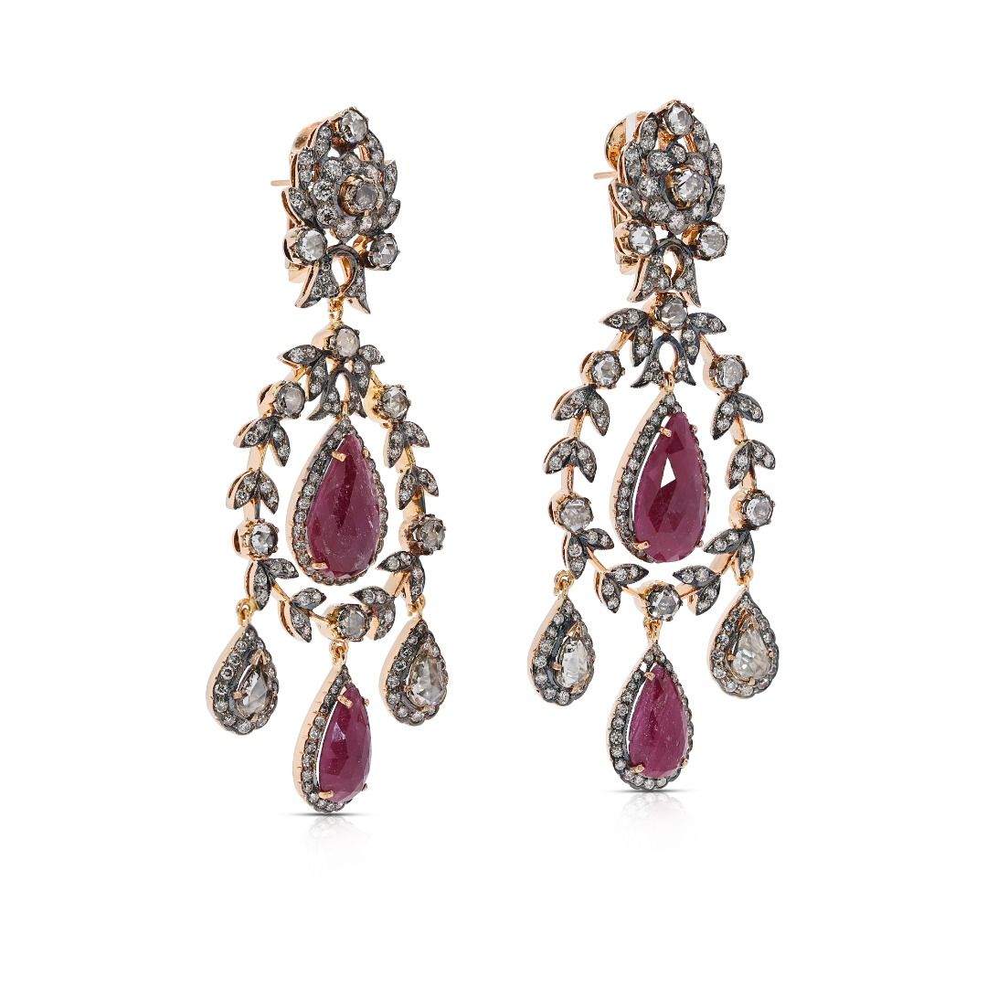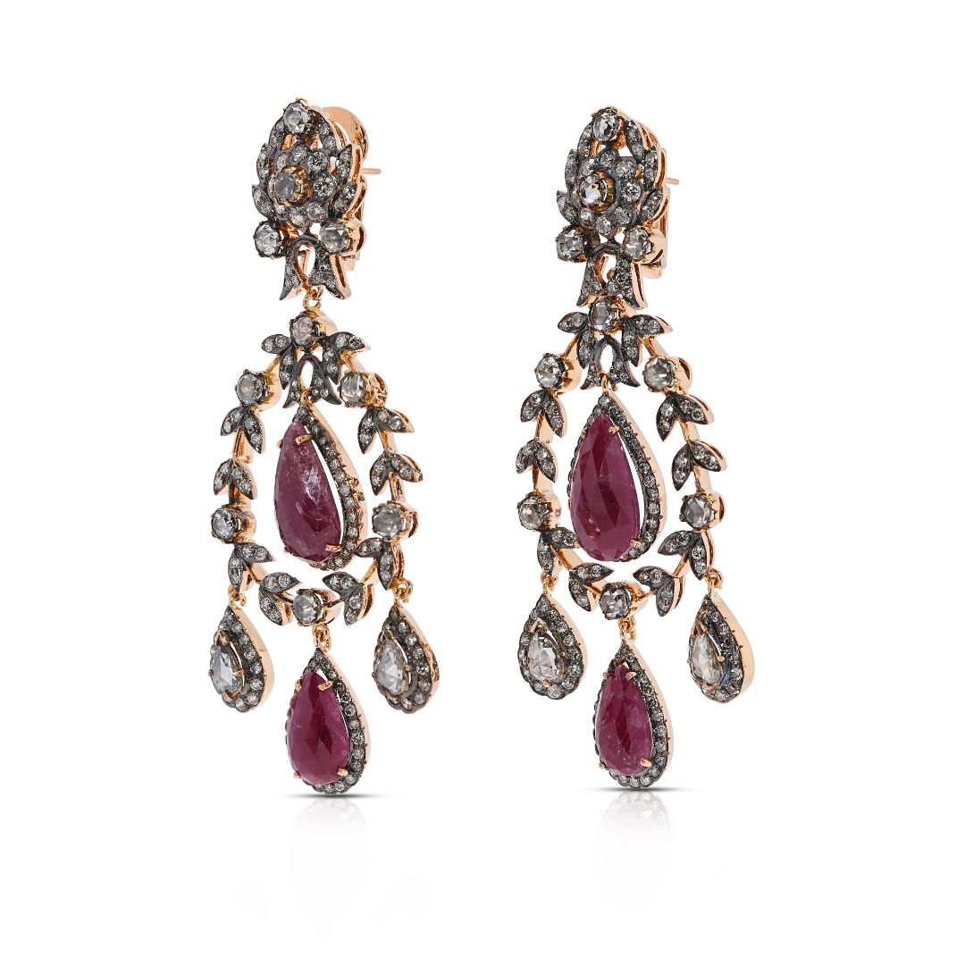 צרי כניסה בלתי נשכחת עם עגילי שנדלייר דרמטיים אלו, המהווים תכשיט עילית, המשובצים ב-7.8 קרט של אבני רובי אדומות עסיסיות בחיתוך אגס, המשובצות בצללית מלכותית ומורכבת. העיצוב הארכיטקטוני עשוי במומחיות בזהב דו-גוני 18 קראט, עם גימור מושחר בסגנון וינטג' המשלים באופן מושלם את יהלומי השמפניה בחיתוך רוז במשקל 1.96 קרט ואת יהלומי השמפניה בחיתוך עגול מבריק במשקל 1.86 קרט. באורך מרשים של 77 מ"מ, עגילים אלו מציגים מוטיב עדין של עלים וגפנים הממסגר את טיפות הרובי התוססות, ויוצר תחושה מרהיבה של תנועה ופאר עתיק. במשקל משמעותי של 35.27 גרם, עגילים אלו מאובטחים באמצעות סוגרי קליפס ומוט פרימיום, המבטיחים בטיחות ונוחות כאחד עבור הצהרה ראויה לשטיח האדום.