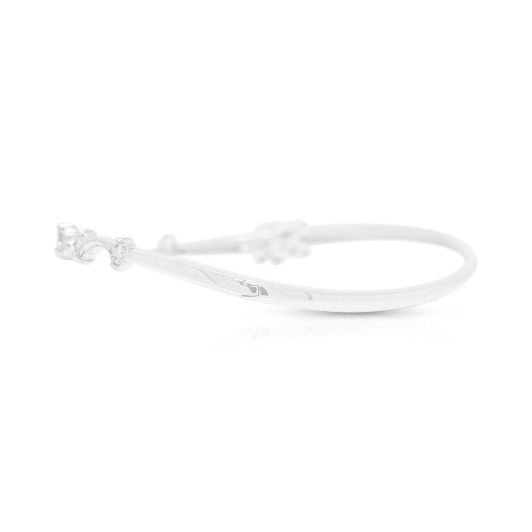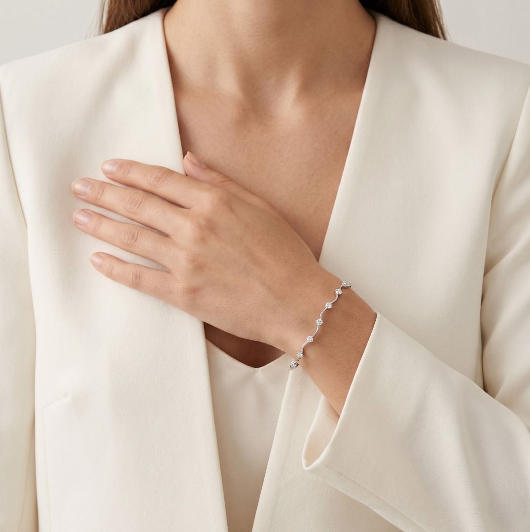 צמיד אלגנטי זה עשוי מזהב לבן 18 קראט, ומשובץ בשבעה יהלומים עגולים בחיתוך בריליאנט (סה"כ 0.25ct, צבע H, ניקיון VS) המשולבים בעיצובו החינני. במשקל תכשיט של 7.33g, הוא משלב ניצוץ עדין עם אומנות מוקפדת. פריט מתוחכם המדגיש אלגנטיות נצחית, מושלם לאספני תכשיטים יוקרתיים או כאביזר רב-גוני ללבוש יומיומי ולאירועים מיוחדים כאחד.