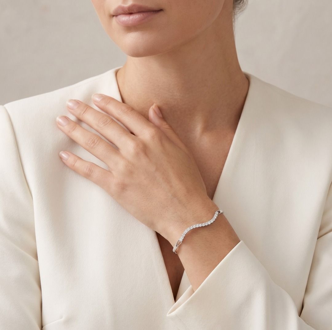 צמיד קשיח גלי מעודן מזהב לבן 18 קראט, משובץ יהלומים במשקל 1 קראט