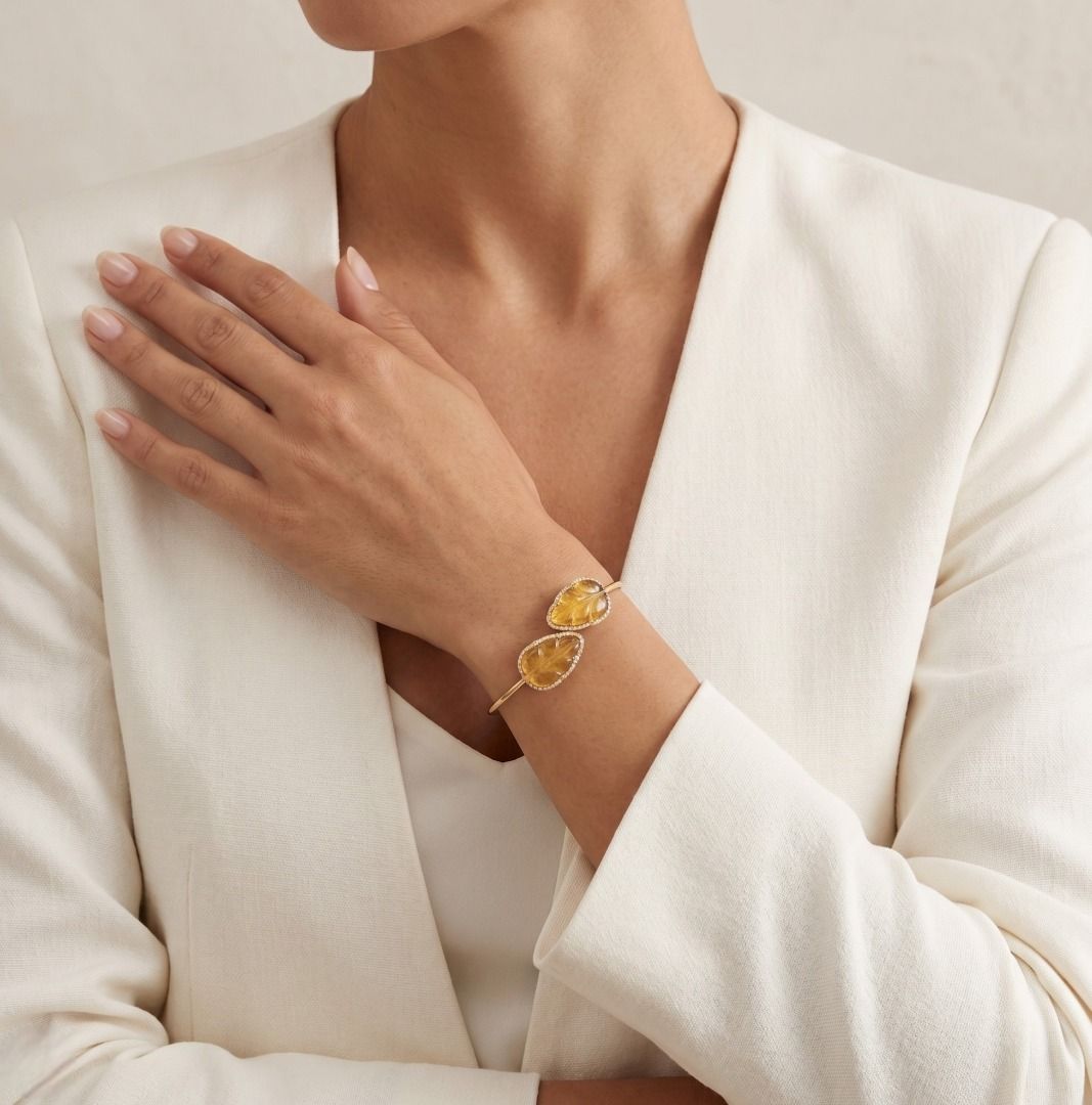 צמיד קשיח יוקרתי זה עשוי מזהב צהוב 18 קראט, משובץ בשני אבני ג'ייד צהוב-דבש מגולפים (19 מ"מ x 11 מ"מ) כנקודות מוקד קורנות. מוקף ב-84 יהלומים עגולים בחיתוך בריליאנט (סה"כ 0.42 קראט, צבע H, ניקיון SI), העיצוב משיג ברק מעודן. עם משקל תכשיט של 6.86 גרם ומידות קוטר פנימי של 55 מ"מ x 43 מ"מ, הוא משלב יופי טבעי עם אומנות יוקרתית. פריט מתוחכם המדגיש אומנות ואלגנטיות, מושלם לאספני תכשיטים יוקרתיים או כהצהרה של יוקרה נצחית.