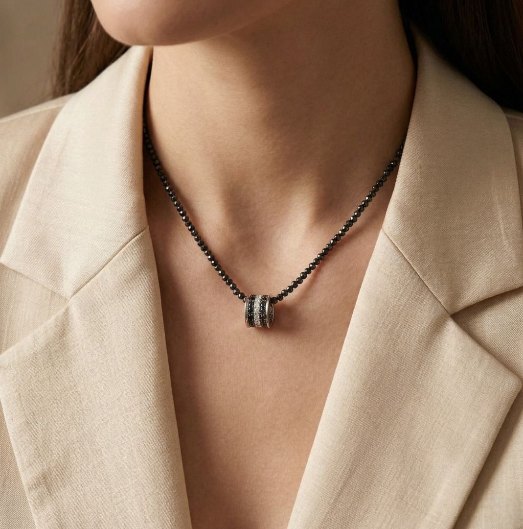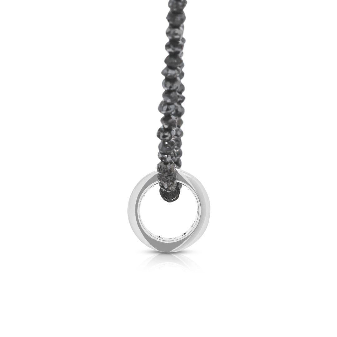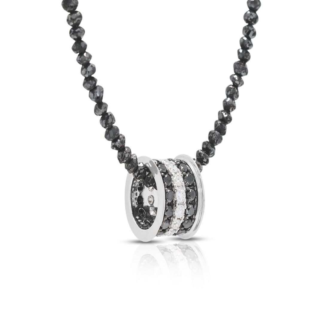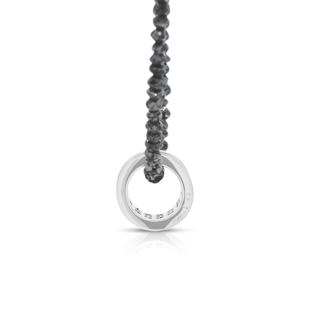 הצהרה נועזת של ניגודיות—שרשרת זו מציגה 18 יהלומים טבעיים בחיתוך עגול מבריק, במשקל כולל של 0.24 קרט (צבע G-H, ניקיון VS), מעוטרת ב-36 יהלומים שחורים בחיתוך עגול מבריק, במשקל כולל של 0.46 קרט. העיצוב מושלם עם 150 חרוזי יהלומים שחורים לא מלוטשים, במשקל כולל יוצא דופן של 150.00 קרט. יחד, הברק מגיע ל-150.70 קרט. עשויה מזהב לבן מלוטש 18K, משקלה 5.84 גרם ואורכה 50 ס"מ.