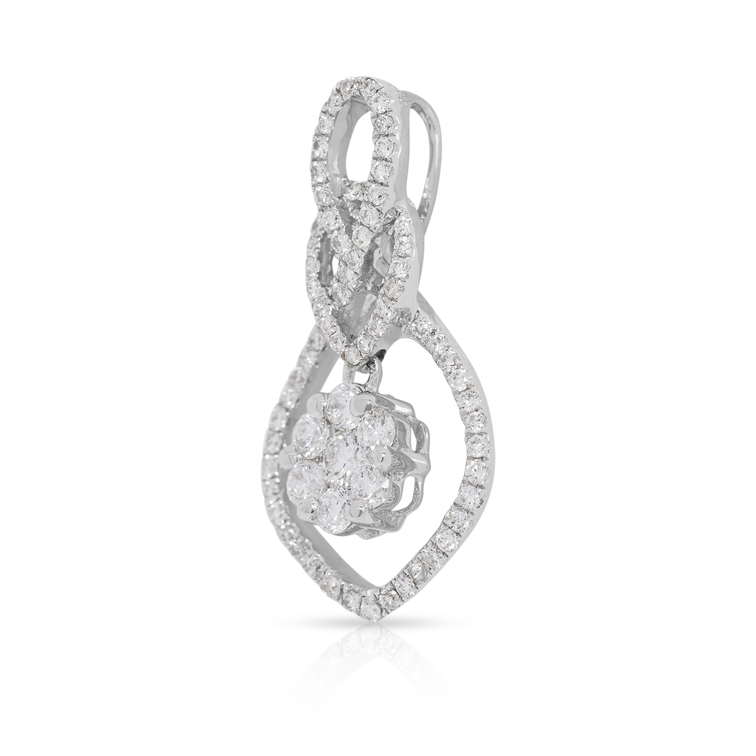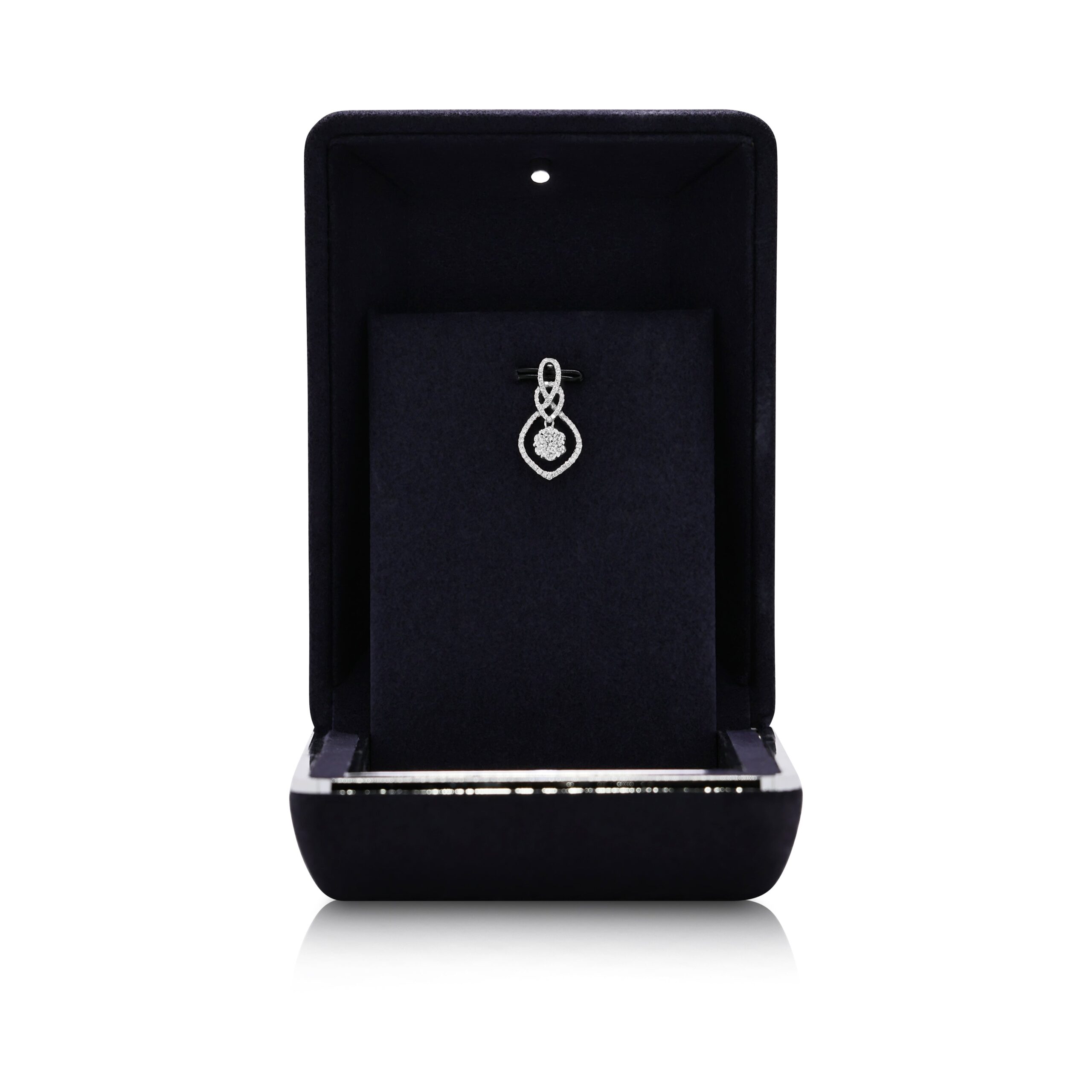 יצירת מופת של ברק ועידון, תליון זה מזהב לבן 18K מציג 73 יהלומים טבעיים בחיתוך עגול מבריק, במשקל כולל של 0.4 קראט, המסודרים בהילת אגס מרשימה בסגנון אשכול שובה לב. היהלומים בצבע G ובניקיון VS מבטיחים נצנוץ יוצא דופן, ומשפרים את האלגנטיות הזוהרת של התליון. במידות 10 מ"מ על 20 מ"מ ובמשקל 1.56 גרם, יצירה מעודנת זו נועדה להצהיר על תחכום וקסם נצחי.
