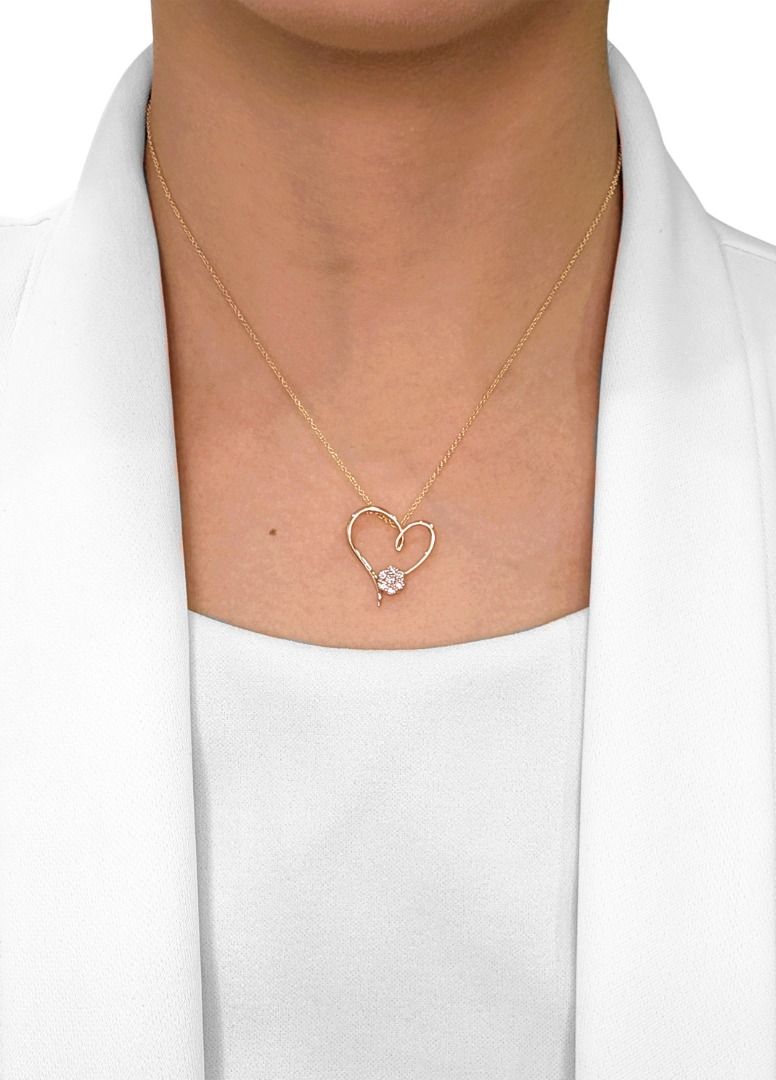 הביעו רגש רומנטי מודרני עם תליון שיקי זה מזהב ורוד 18 קראט, המציג צללית לב פתוח וזורמת המתעקלת בחן אמנותי. אשכול פרחוני נוצץ של שבעה יהלומים טבעיים בחיתוך עגול מבריק משובץ בבסיס המסגרת, בסך הכל 0.17 קרט של זוהר בוהק בצבע H וניקיון VS. הזוהר הוורדרד והחם של הזהב הוורוד מנוגד להפליא לאש הקפואה של היהלומים, מה שהופך פריט זה במשקל 1.89 גרם לאביזר רב-גוני ומשמעותי לאלגנטיות יומיומית. אורכו העדין, 23 מ"מ, מבטיח שהוא יונח בצורה מושלמת על קו הצוואר, ומשמש כהצהרה עדינה אך מתוחכמת של יוקרה.