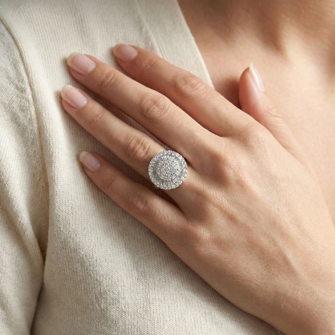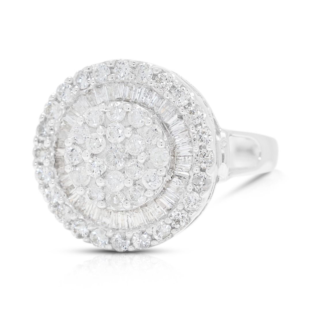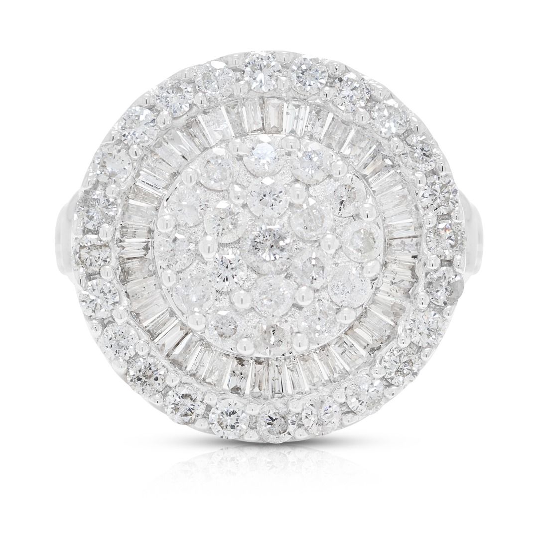 טבעת זו מציגה ברק עז, יצירת מוזאיקה המשלבת אשכול מרכזי של 43 יהלומים טבעיים עגולים בחיתוך בריליאנט, המלווה בטבעת חיצונית של 44 יהלומים טבעיים בחיתוך טייפר. פריט זה עשוי מזהב לבן 18 קראט, חדש ומציג יוקרה טהורה. עיצוב גיאומטרי אלגנטי ורב-ממדי.
