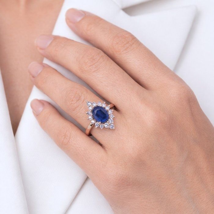 טבעת הצהרה מרהיבה זו מציגה ספיר כחול מלכותי בחיתוך אובל במשקל 2.55ct, המציע קסם עמוק וקטיפתי המשמש כמוקד היצירה.