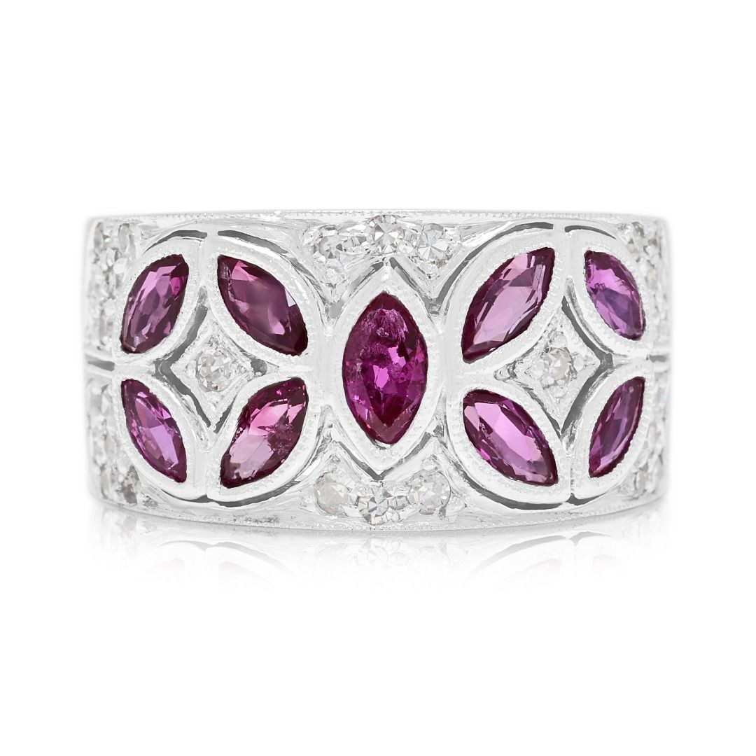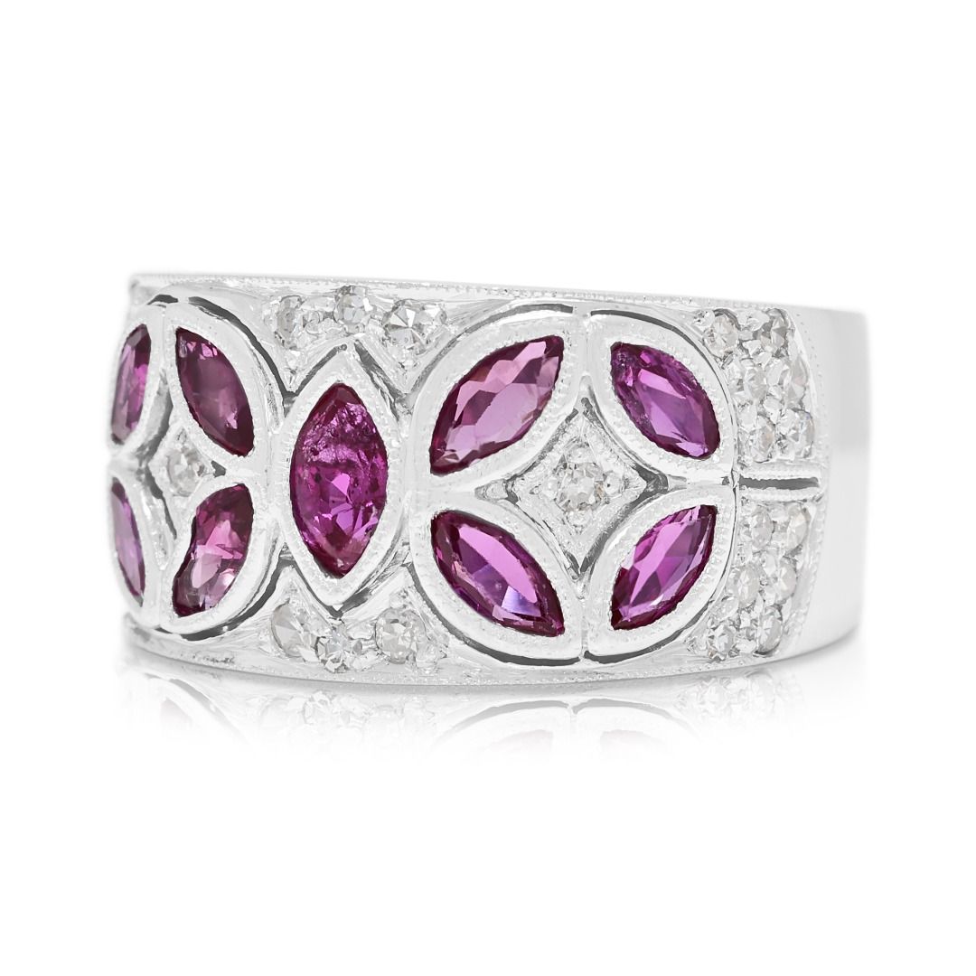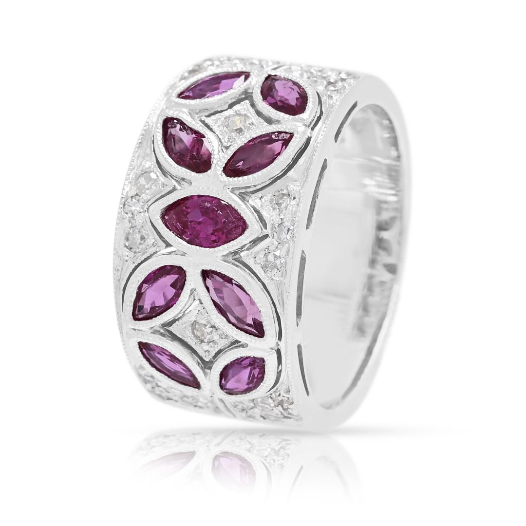 שילוב נועז של צבע וברק—טבעת מעצבים זו של Larry Jewelry משובצת ב-9 אבני רובי בחיתוך מרקיזה במשקל כולל של 1.15 קראט בגוון סגול עשיר, מודגשת על ידי 30 יהלומים טבעיים בחיתוך עגול מבריק במשקל כולל של 0.30 קראט (צבע G-H, ניקיון VS-SI). יחד, הברק מגיע ל-1.45 קראט. עשויה מזהב לבן מלוטש 18 קראט, משקלה 10.26 גרם ומתאימה למידה 51EU / 13HK.