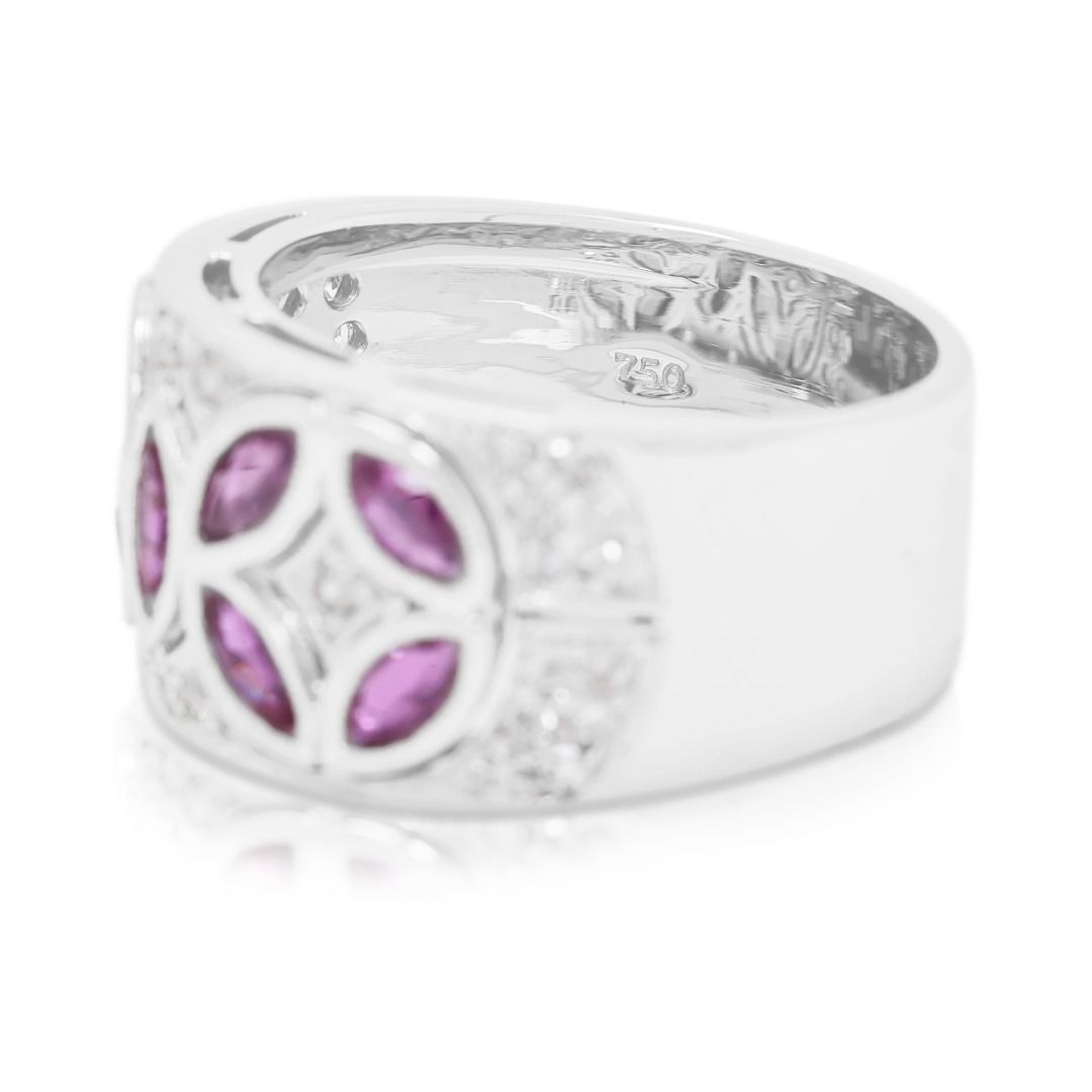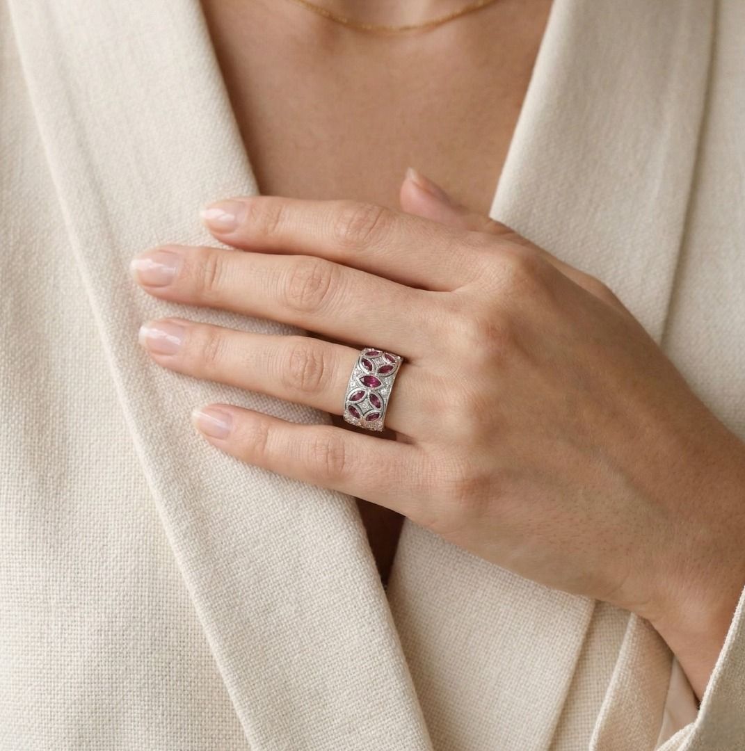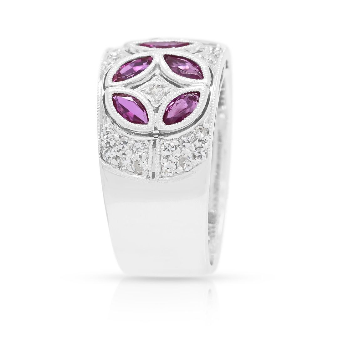 שילוב נועז של צבע וברק—טבעת מעצבים זו של Larry Jewelry משובצת ב-9 אבני רובי בחיתוך מרקיזה במשקל כולל של 1.15 קראט בגוון סגול עשיר, מודגשת על ידי 30 יהלומים טבעיים בחיתוך עגול מבריק במשקל כולל של 0.30 קראט (צבע G-H, ניקיון VS-SI). יחד, הברק מגיע ל-1.45 קראט. עשויה מזהב לבן מלוטש 18 קראט, משקלה 10.26 גרם ומתאימה למידה 51EU / 13HK.